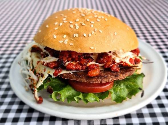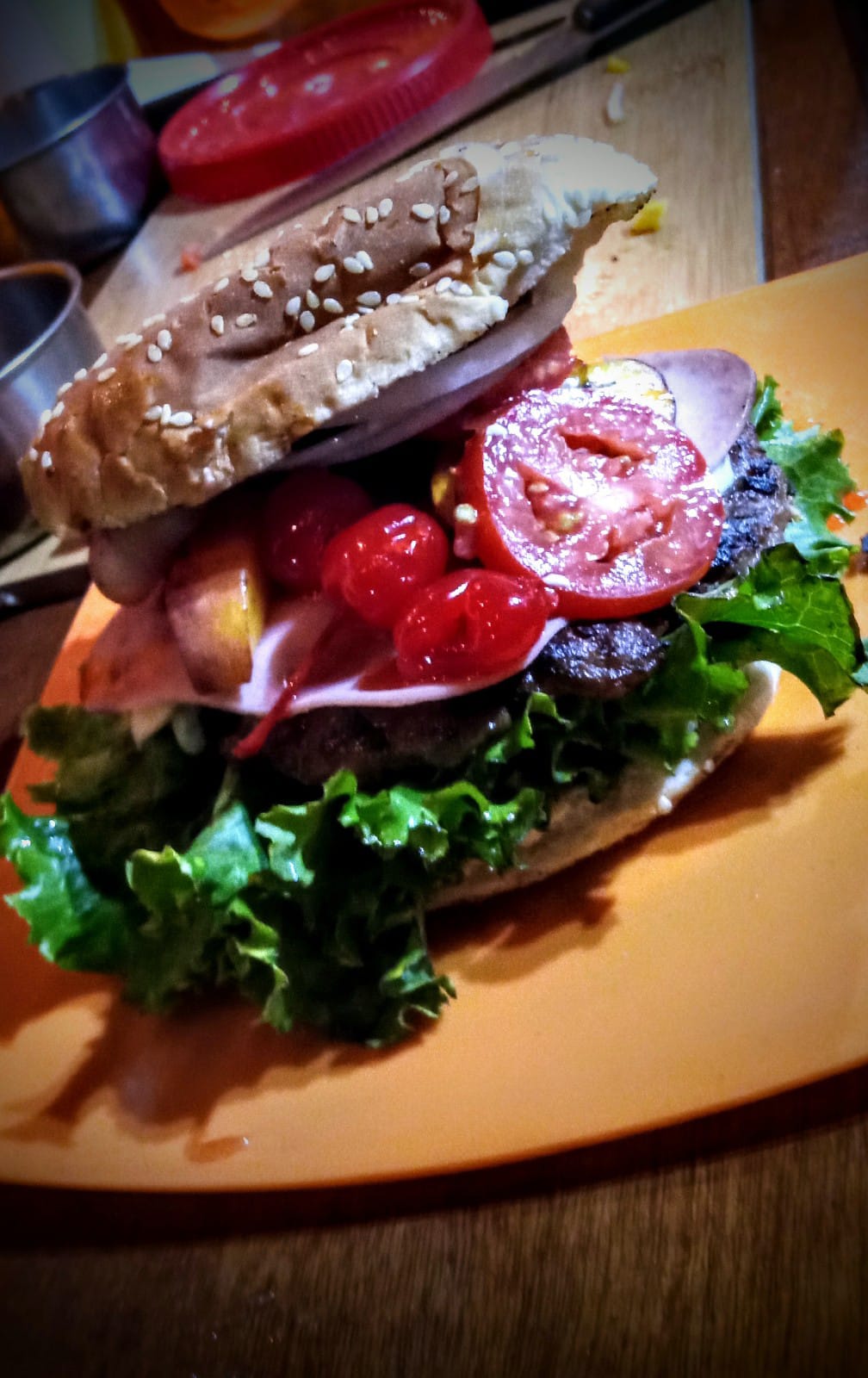 Hamburguesa personal, carne de res aproximadamente 100 g de la casa artesanal, jamón, queso amarillo, cebolla, jitomate, chiles jalapeños, lechuga italiana, cátsup, mostaza, mayonesa y súper bollo con ajonjolí.