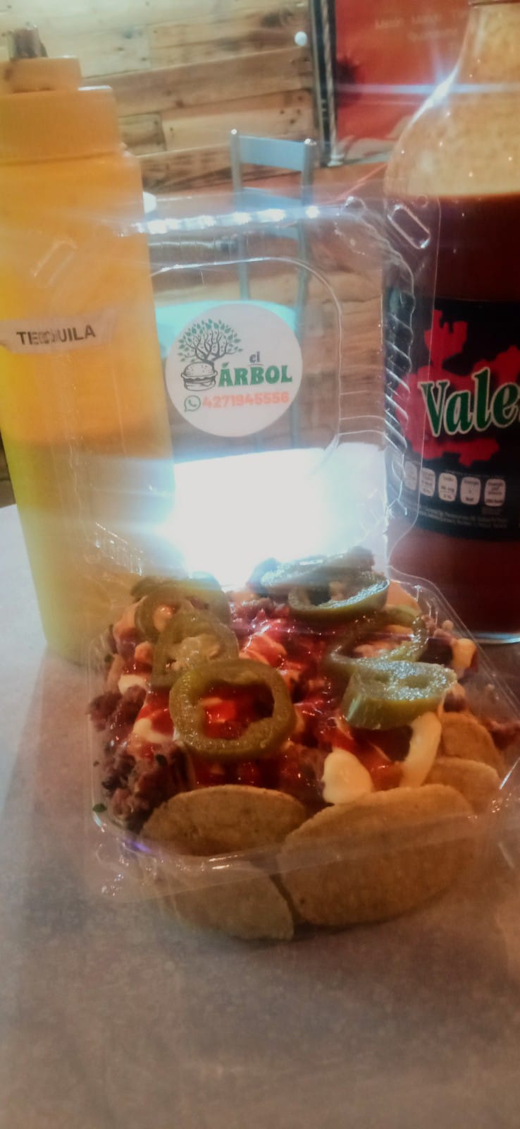 Nachos más carne de hamburguesa picada, cátsup, salsa, queso amarillo y ranch.