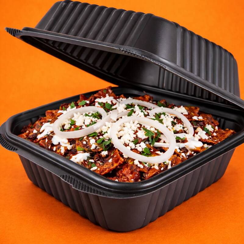 Chilakiles al gusto con salsa de morita,queso manchego,crema,cebolla blanca y cilantro,acompañados con 80 gramos de la proteina de tu preferencia