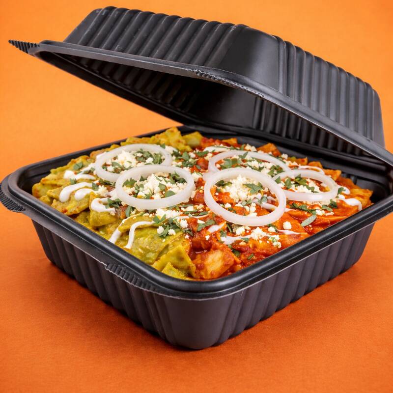 Chilakiles al gusto con salsa verde y roja,queso manchego,crema,cebolla blanca y cilantro,acompañados con 80 gramos de la proteina de tu preferencia