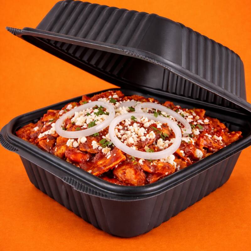 Chilakiles al gusto con salsa roja,queso manchego,crema,cebolla blanca y cilantro,acompañados con 80 gramos de la proteina de tu preferencia