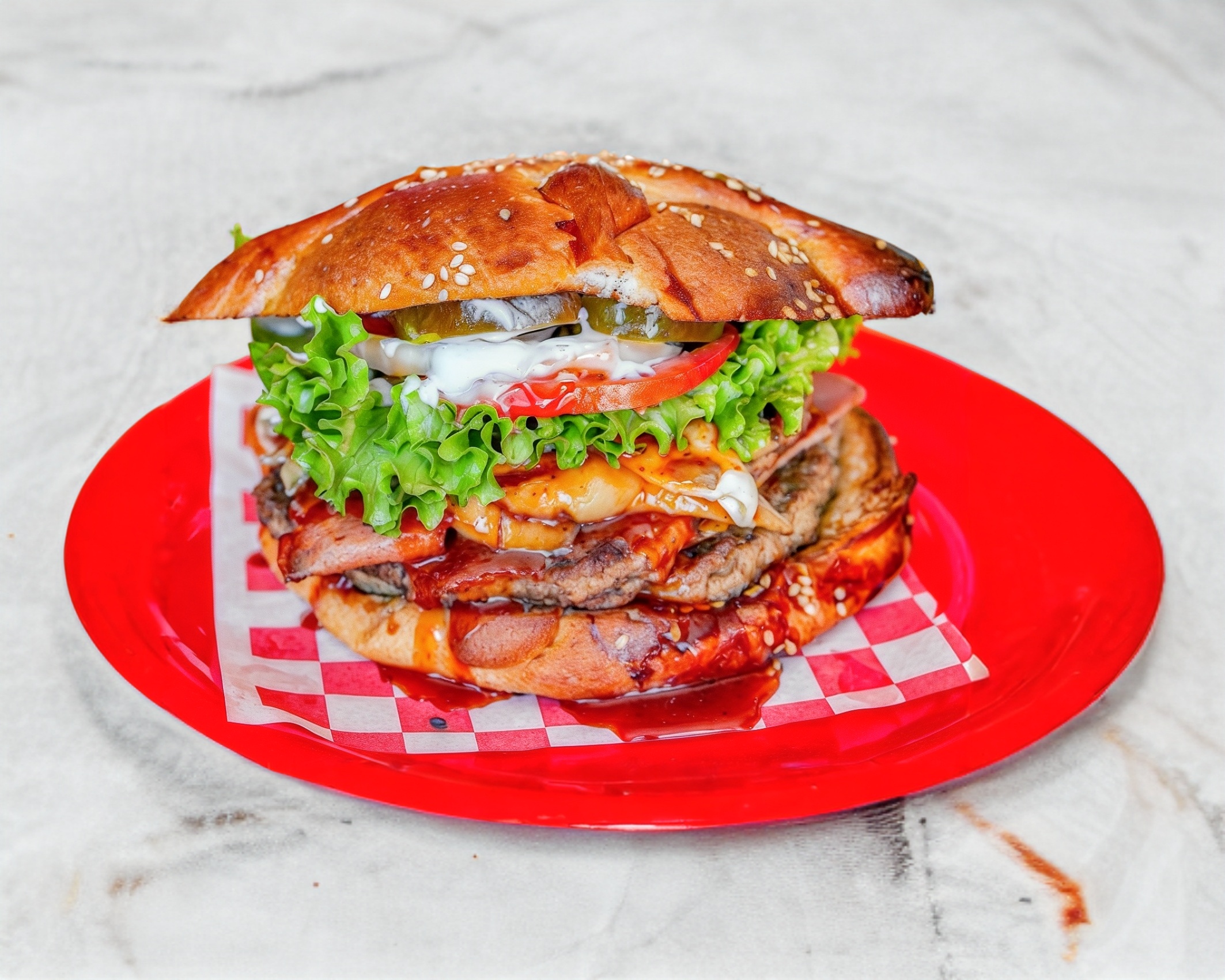 Salsa BBQ, doble carne, champiñones, tocino y queso.