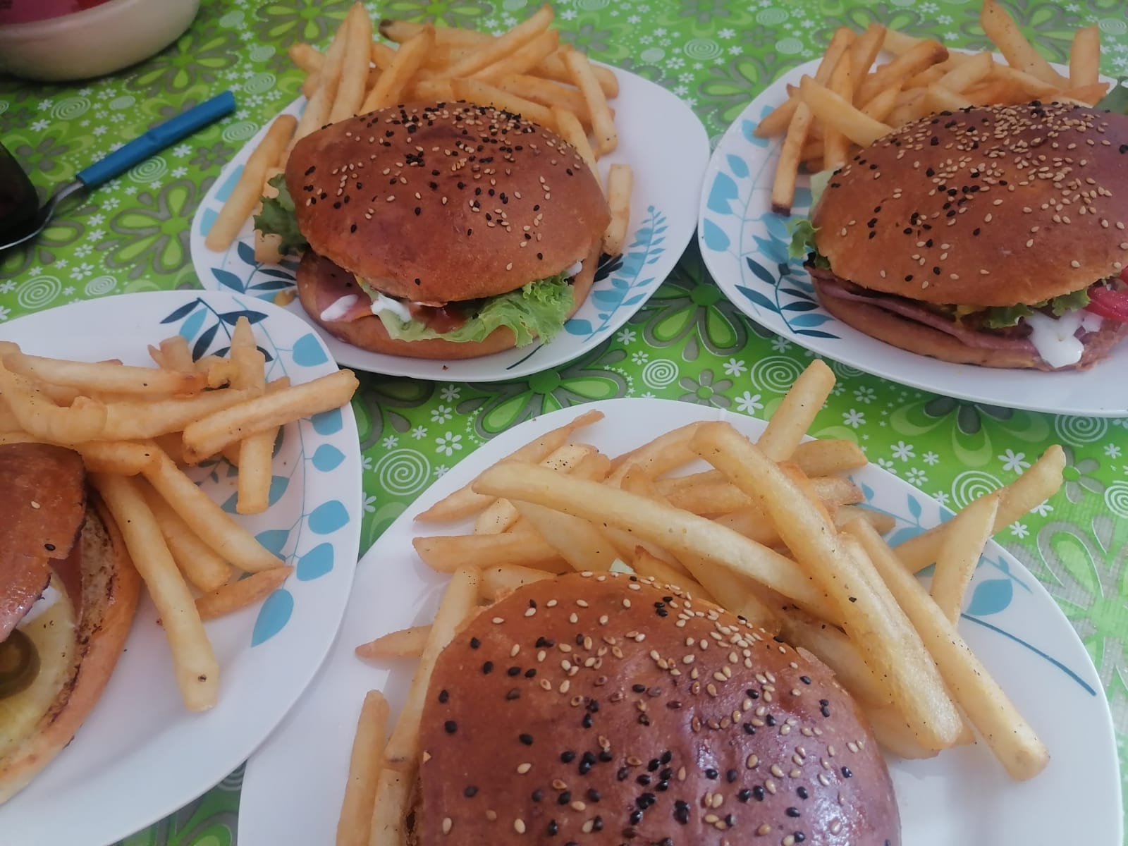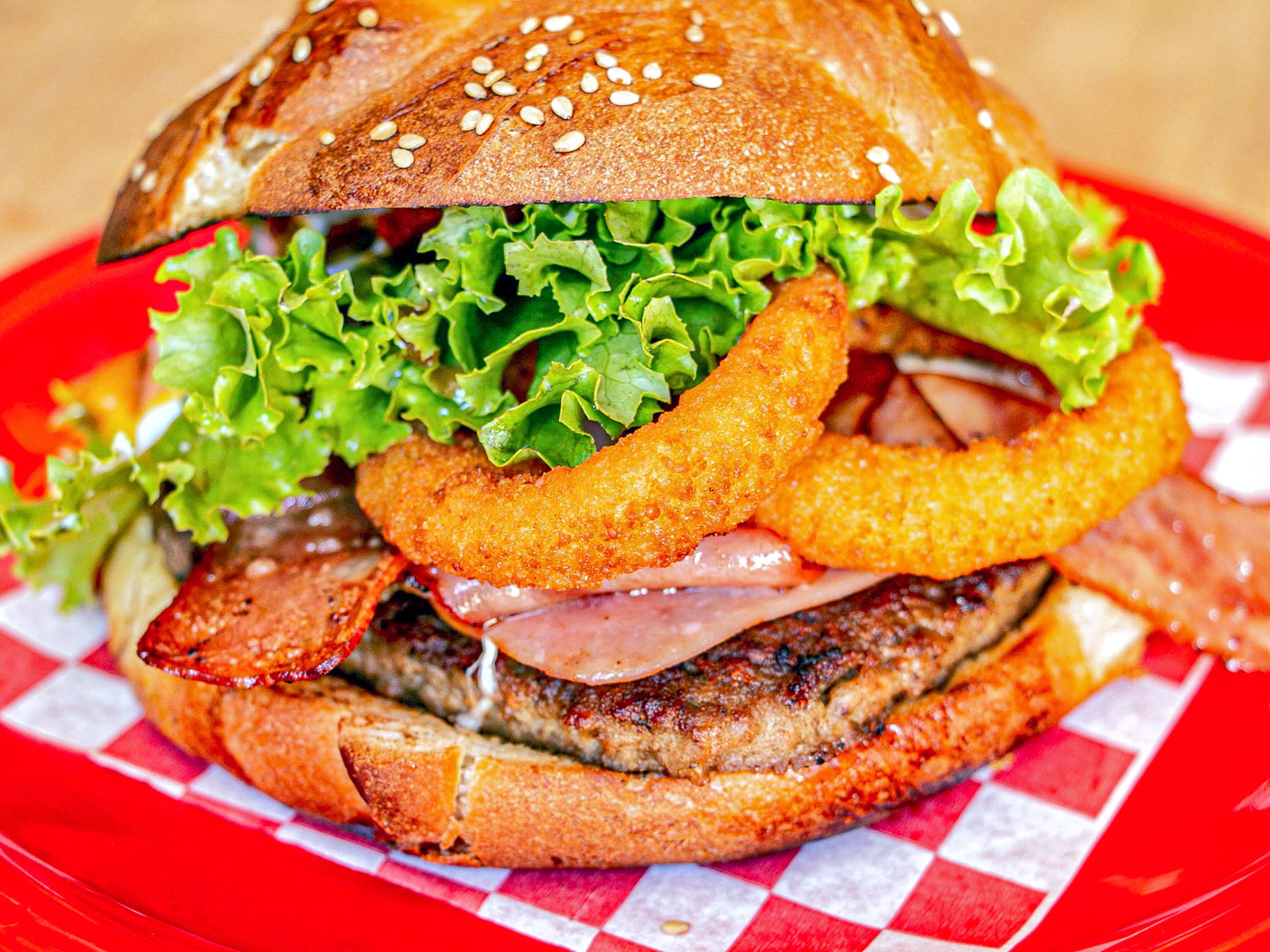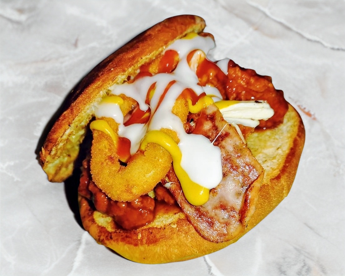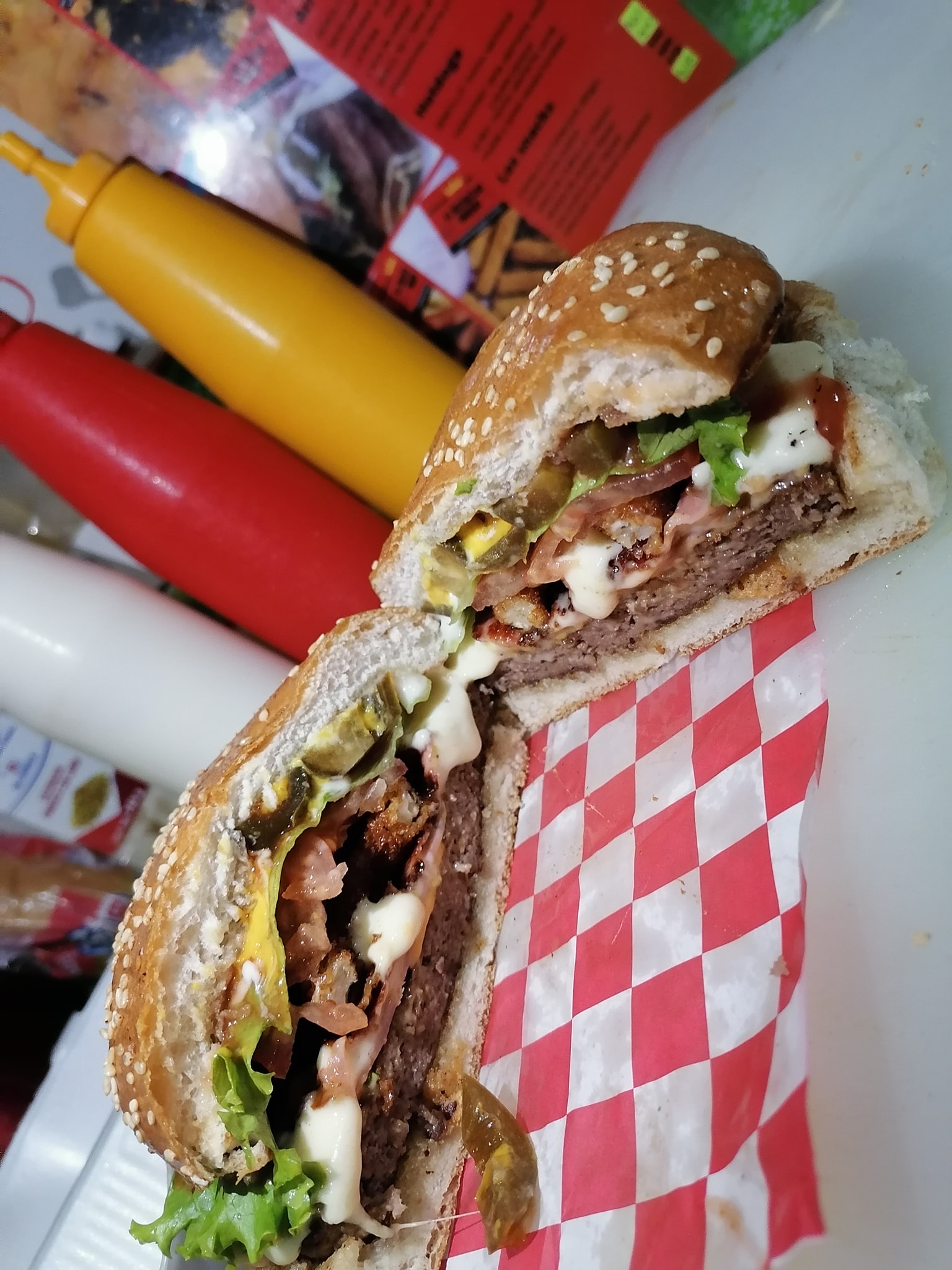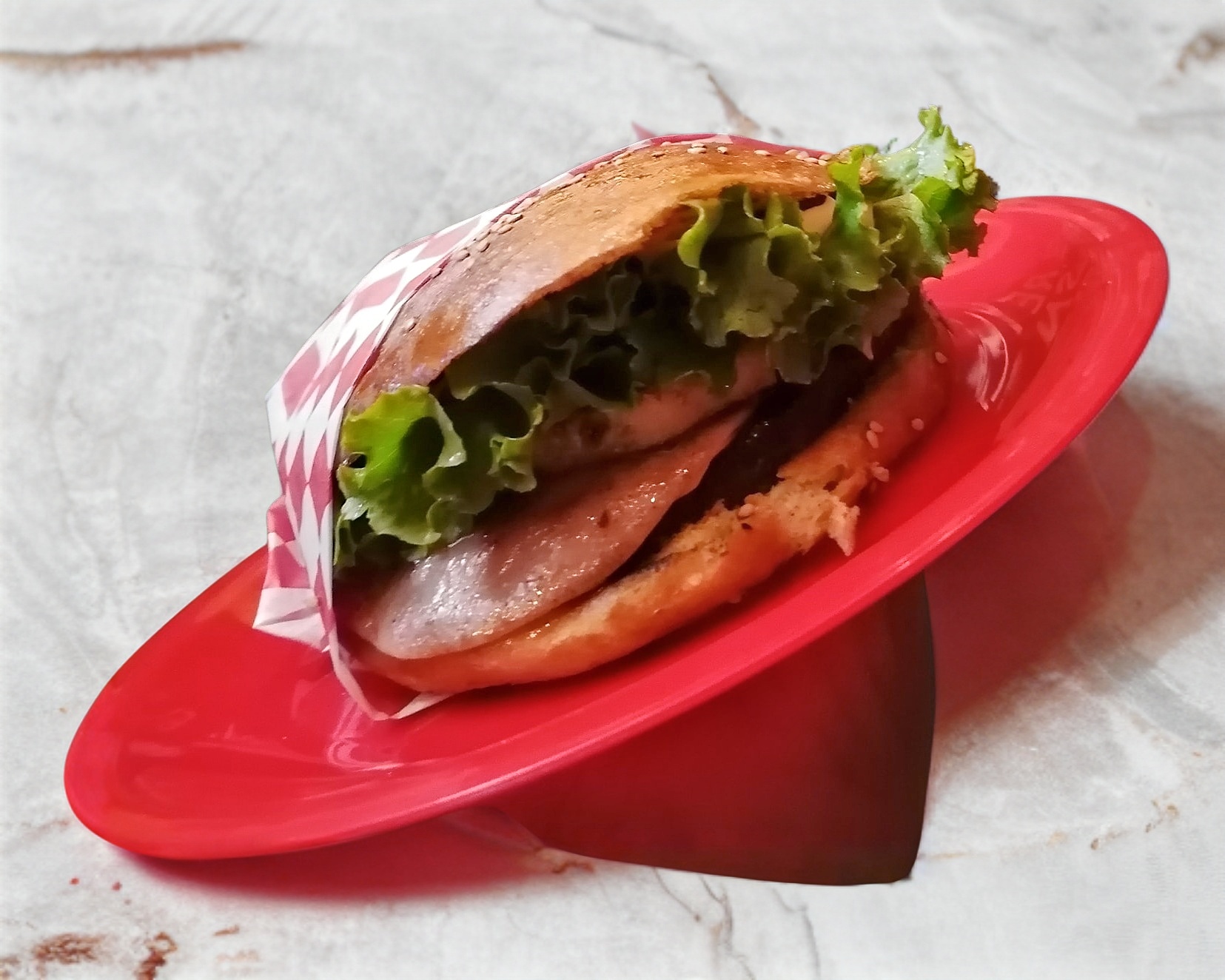Hamburguesa con chorizo, tocino, manchego y jamón.