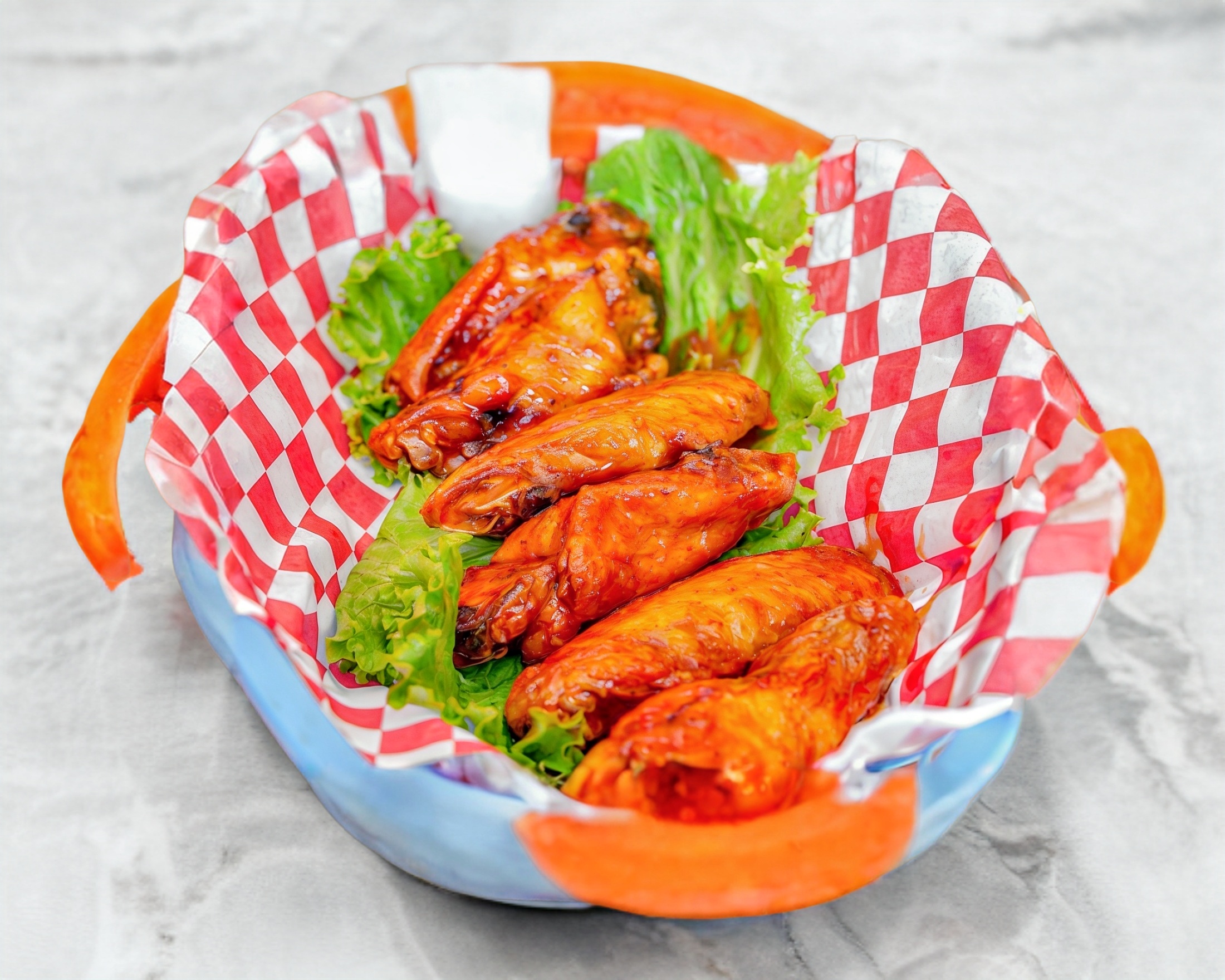 Boneles bañados en salsa de tu agrado, tocino, aros de cebolla, queso fundido y aderezos.