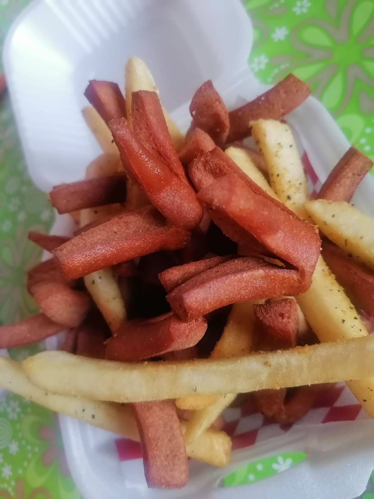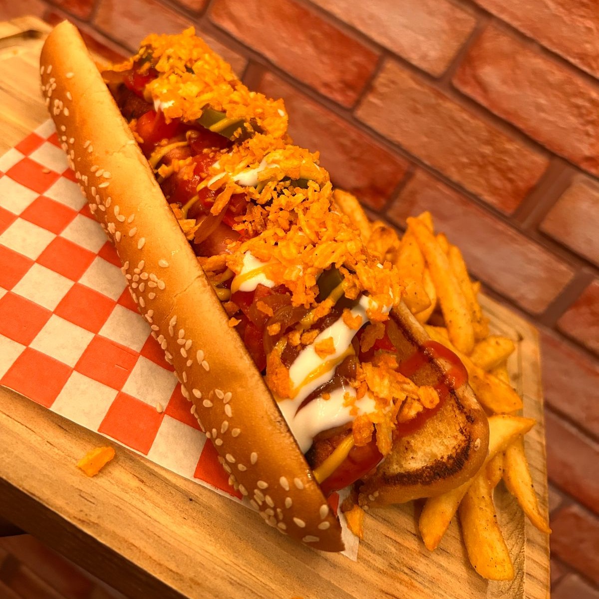 Salchicha con papas con base de queso cheddar y salsa de tu agrado.