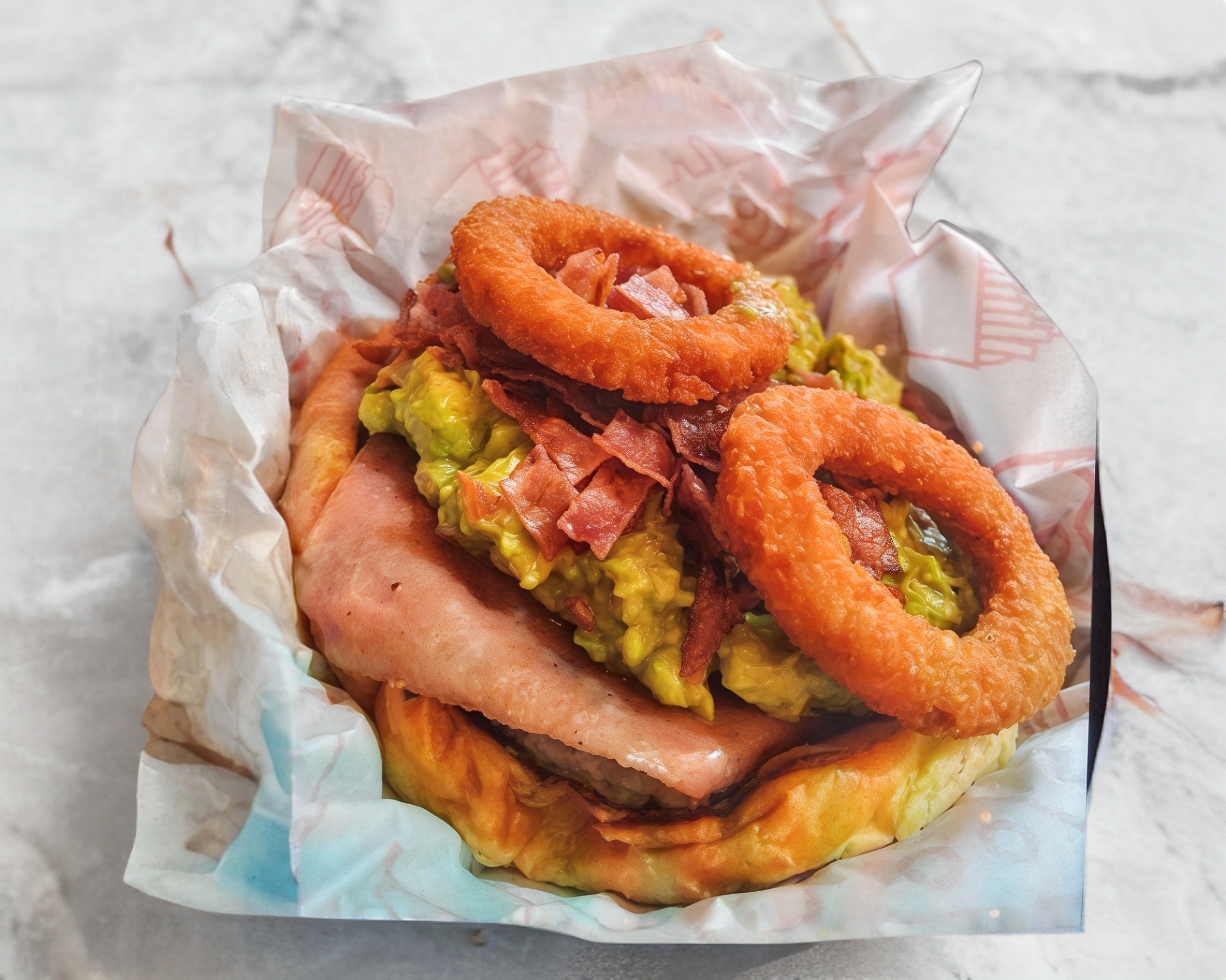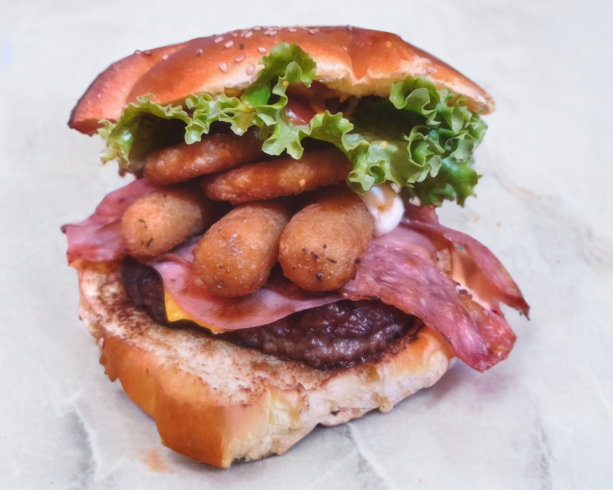 Doble tocino, queso fundido Oaxaca ,aros de cebolla,jamón y manchego.