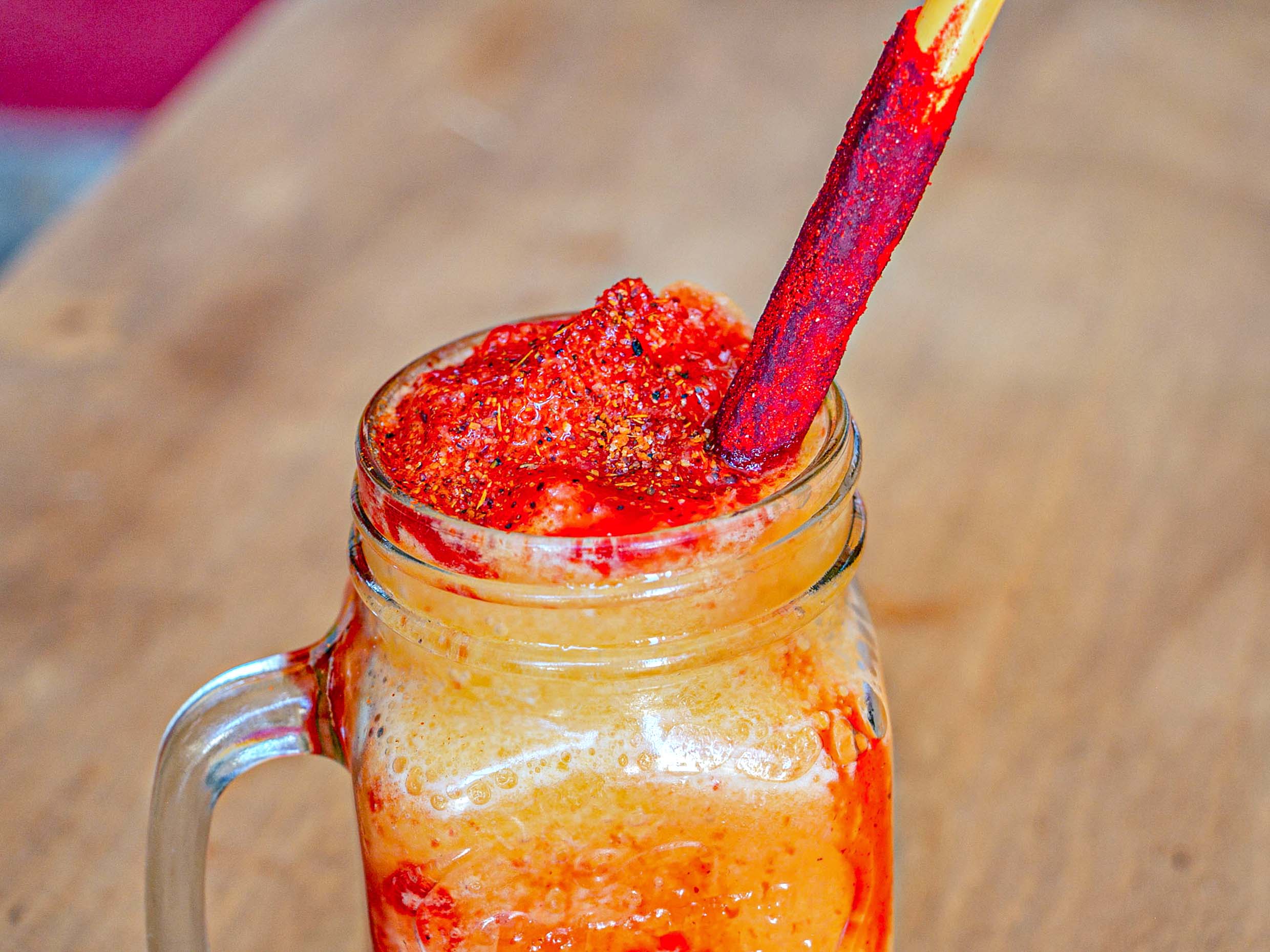 Carne de arrachera camarones sazonados bañados de queso fundido,aros de cebolla y trozitos de tocino.