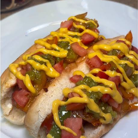 Acompañado de jitomate, cebolla, chiles, salchicha, catsup y mostaza.