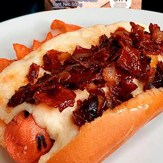 Acompañado de jitomate, cebolla, chiles, salchicha, tocino, costra de queso, salsa, queso amarillo y catsup.