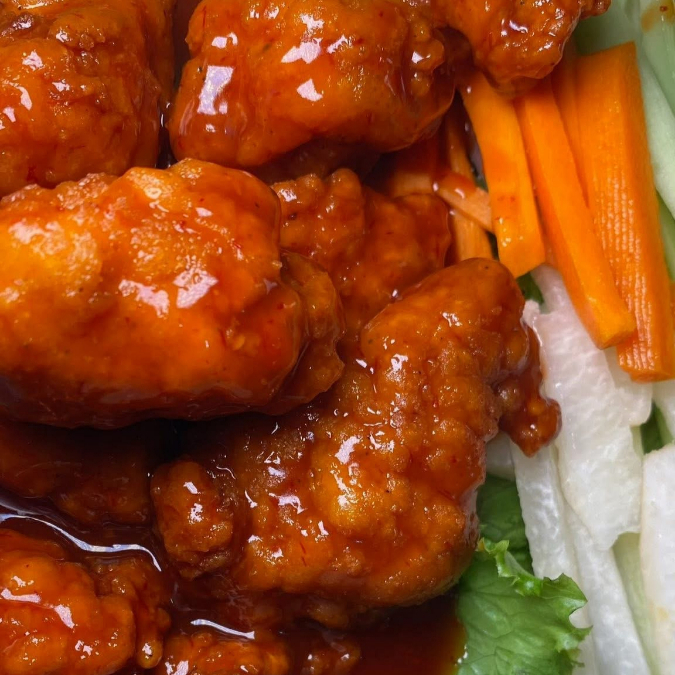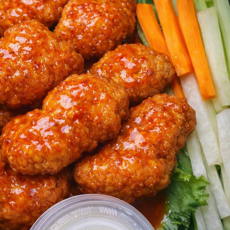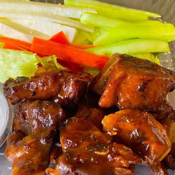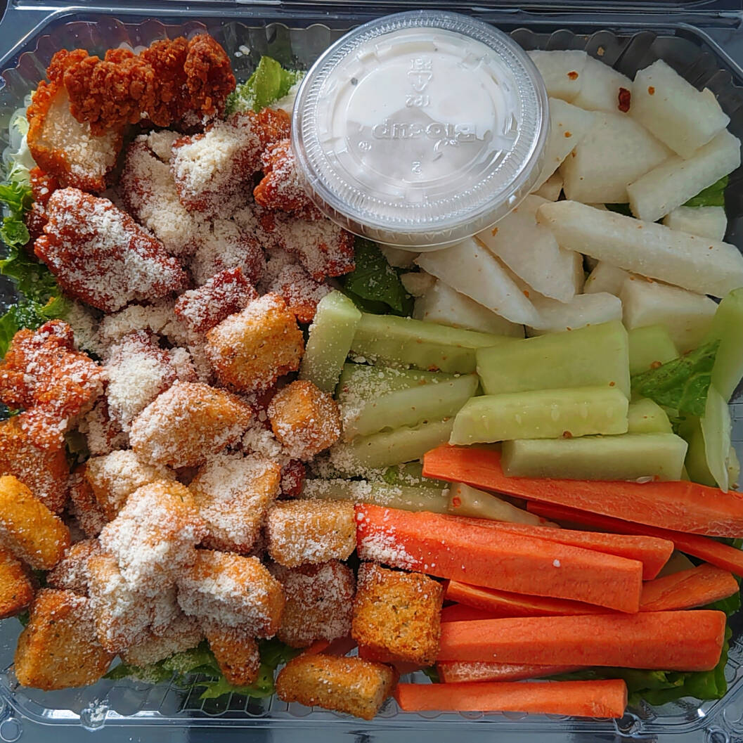 boneless sobre una cama de lechuga, con tiras de pepino, zanahoria, jicama, con el aderezo de su preferencia!!