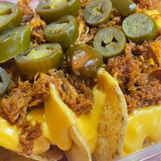 Nachos con queso amarillo, chilorio y chile jalapeño
