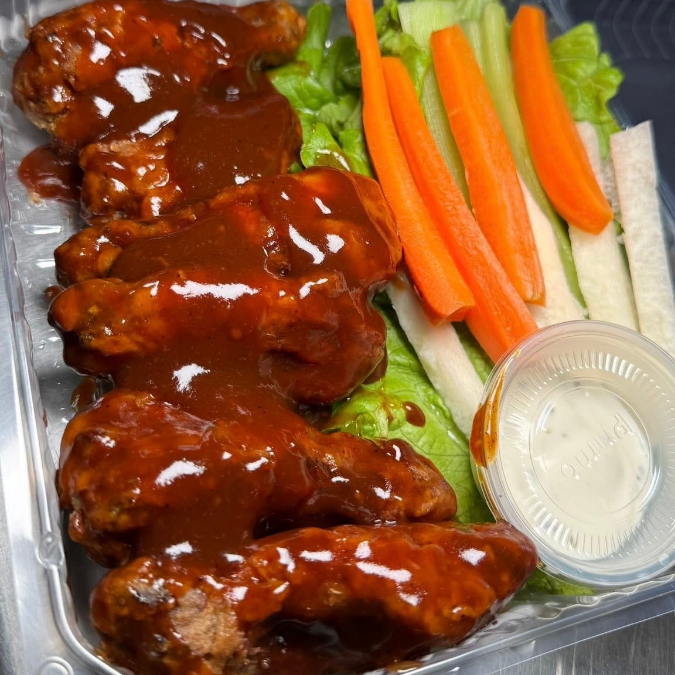 6 piezas de alitas sobre una cama de lechuga, con tiras de pepino, jicama, zanahoria y el aderezo de tu preferencia