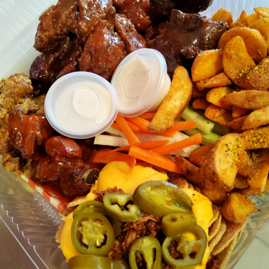 20 alitas combinadas (4 aderezos a elegir) 10 boneless o nuggets o costillas ( 2 aderezos a elegir) .200 grs de papa a la francesa ( 2 sazonadores a elegir ) .150 grs de nachos con queso amarillo y chilorio