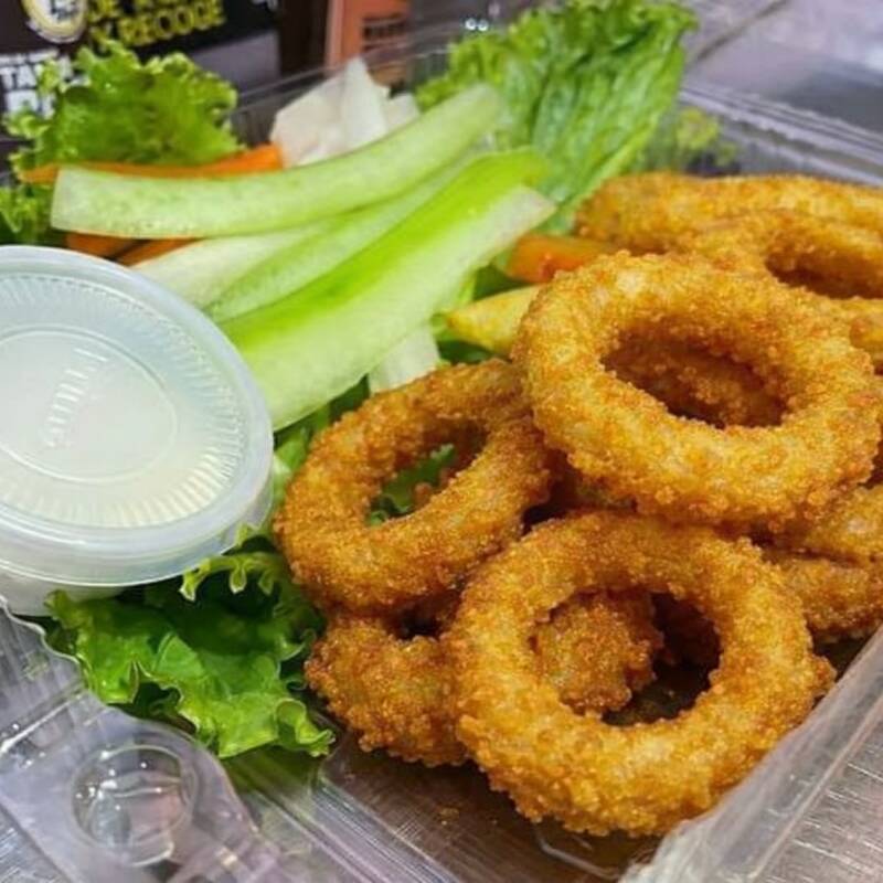 aros de cebolla sobre una cama de lechuga, pepino, jicama y zanahoria con el aderezo de tu preferencia