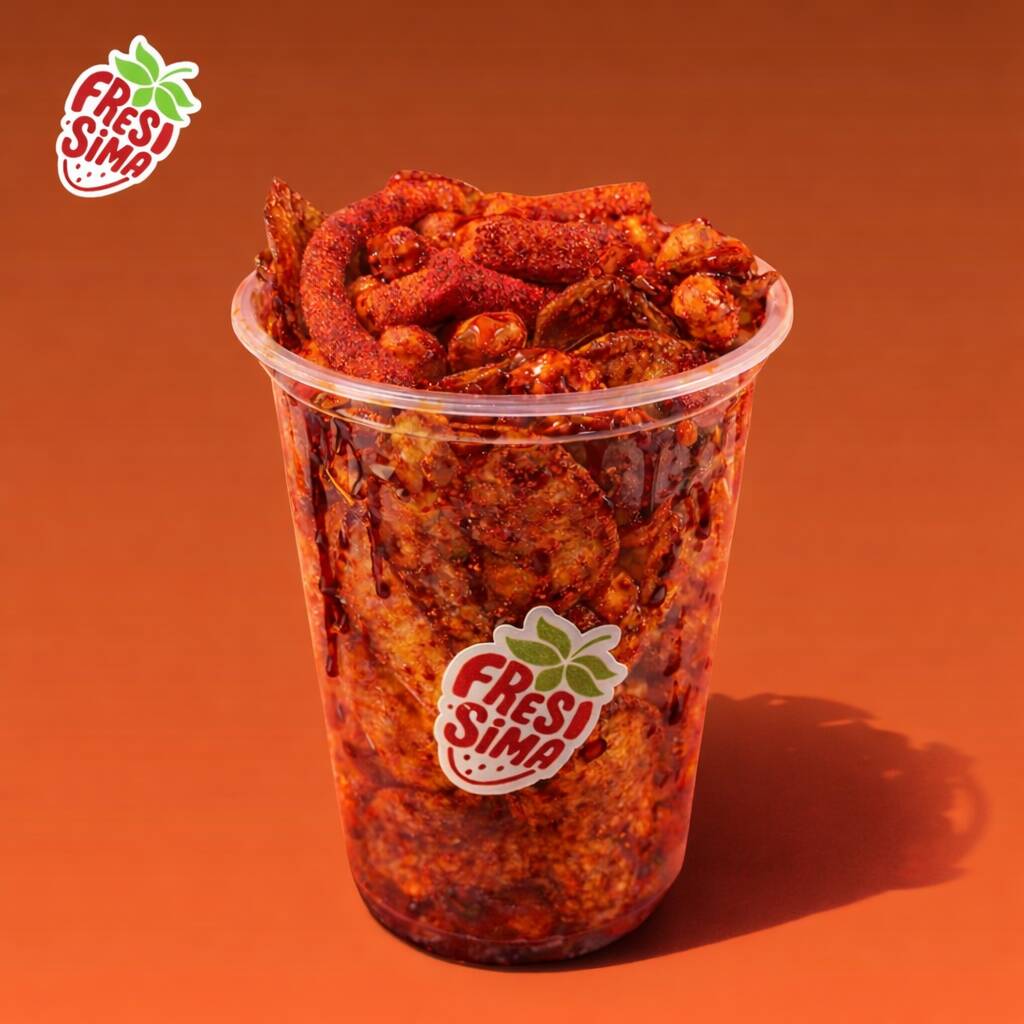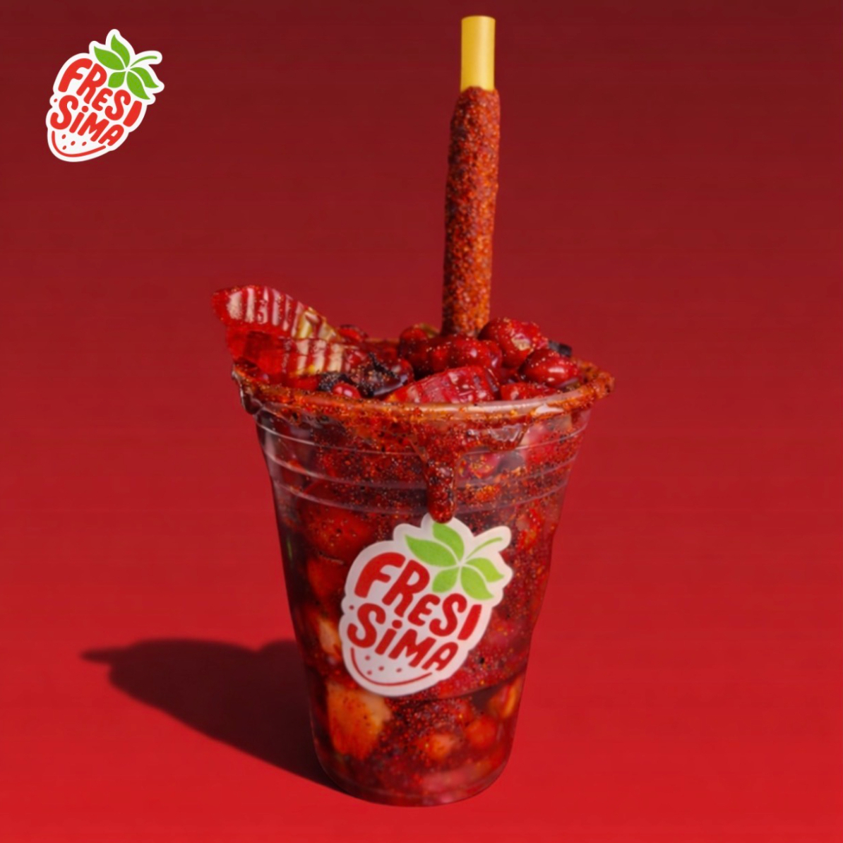 Fresas con un mix de chamoy, tajin, miguelito; Acompañados de gomitas, picafresas, checolines y una banderilla de tamarindo.