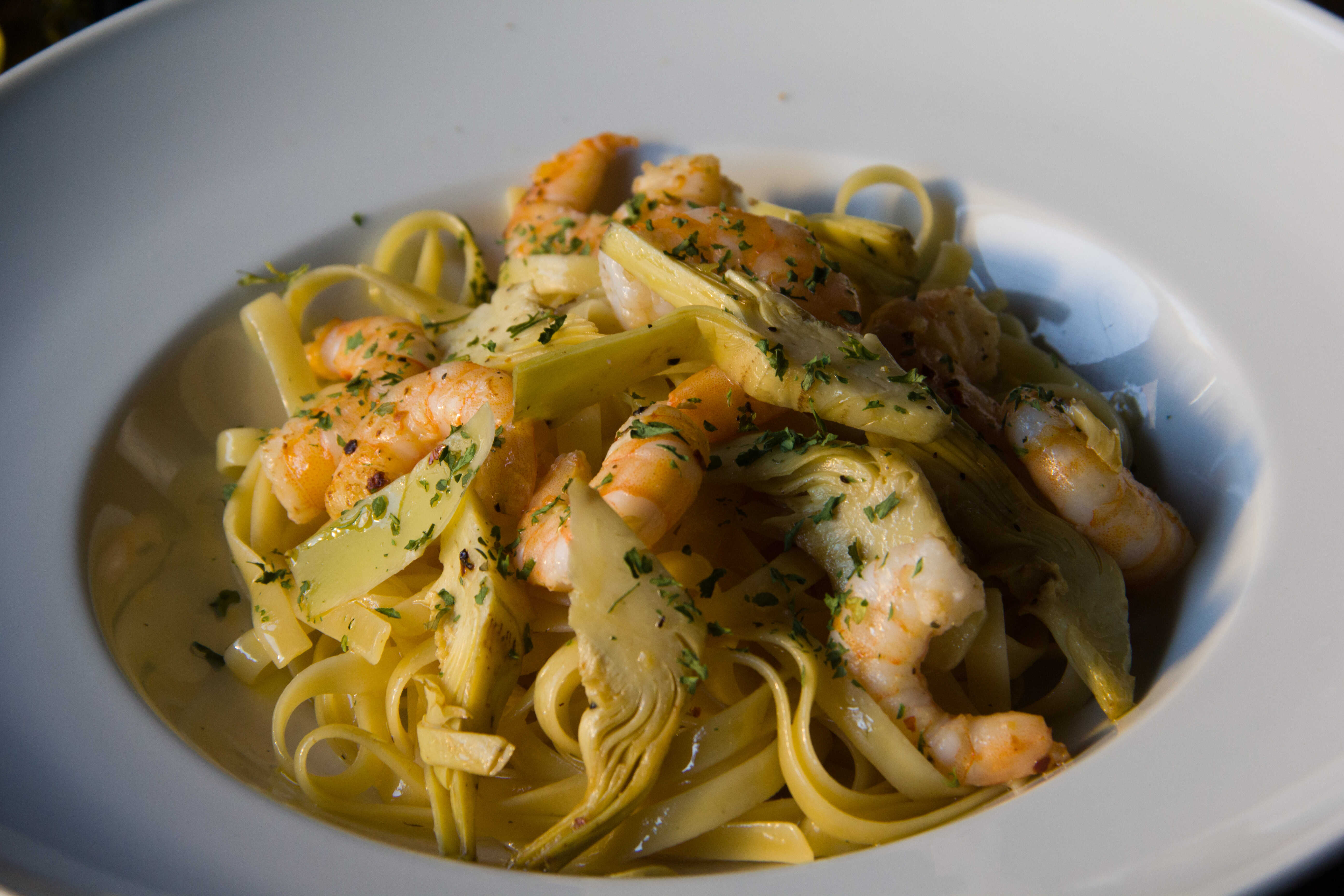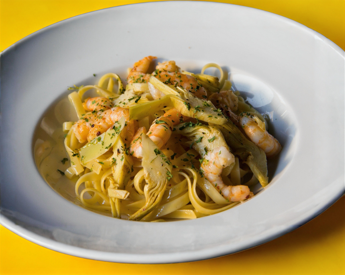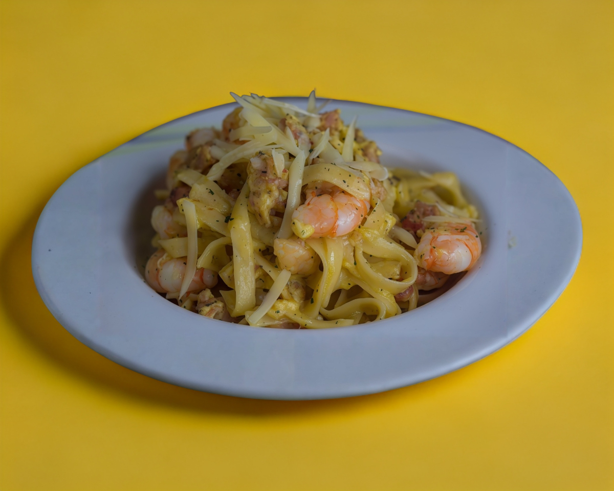 Fetuccine, tocino, camarones, huevo y queso parmesano.