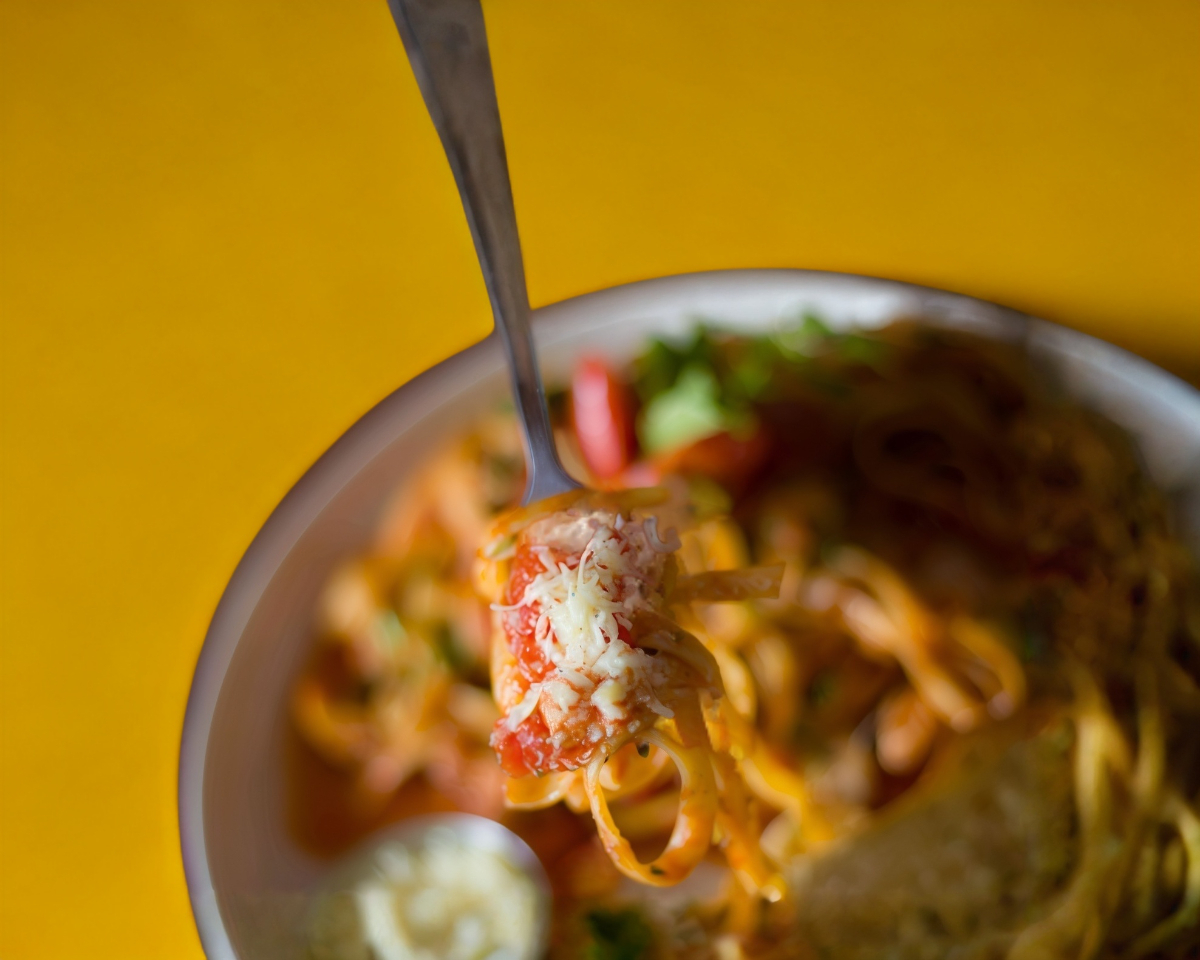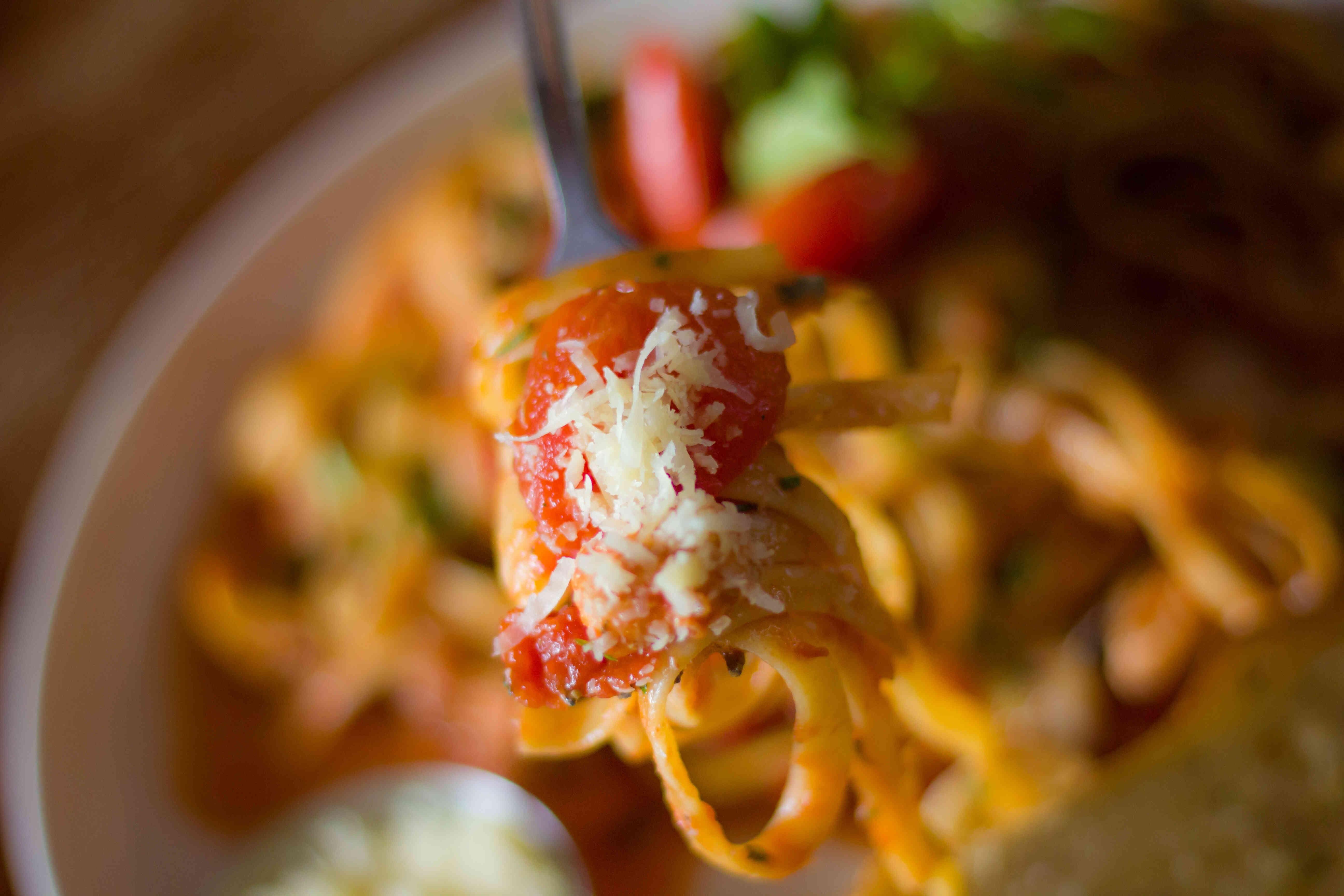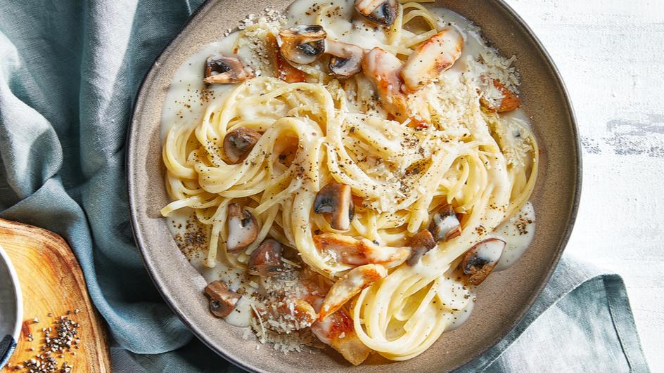 Fetuccine, tocino, camarones, huevo y queso parmesano.