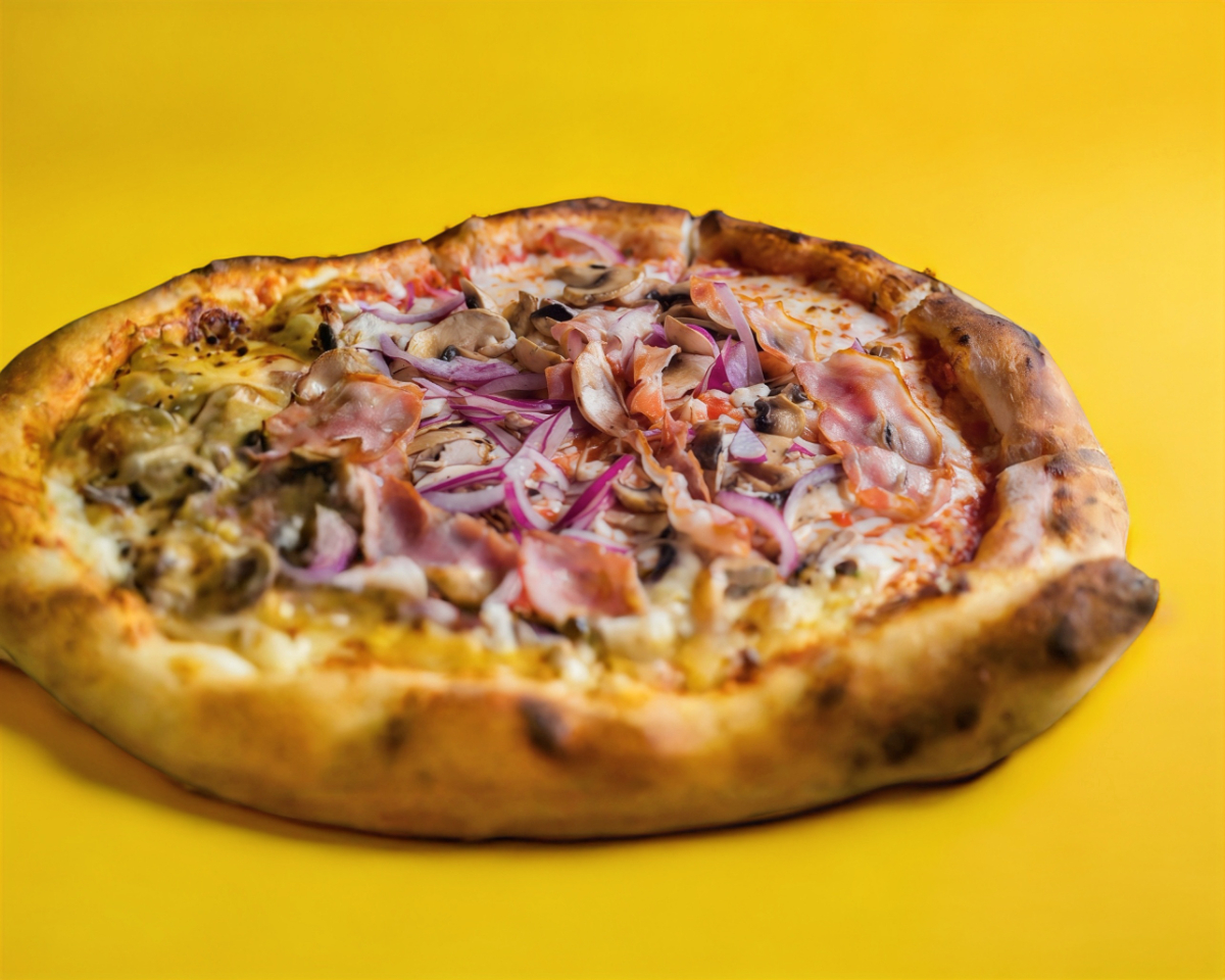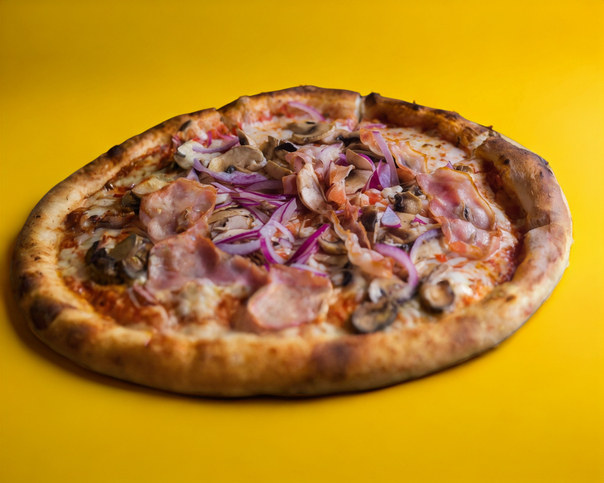 Salsa de tomate, mozzarella, tocino, champiñones, cebolla y provoletta (8rebanadas).