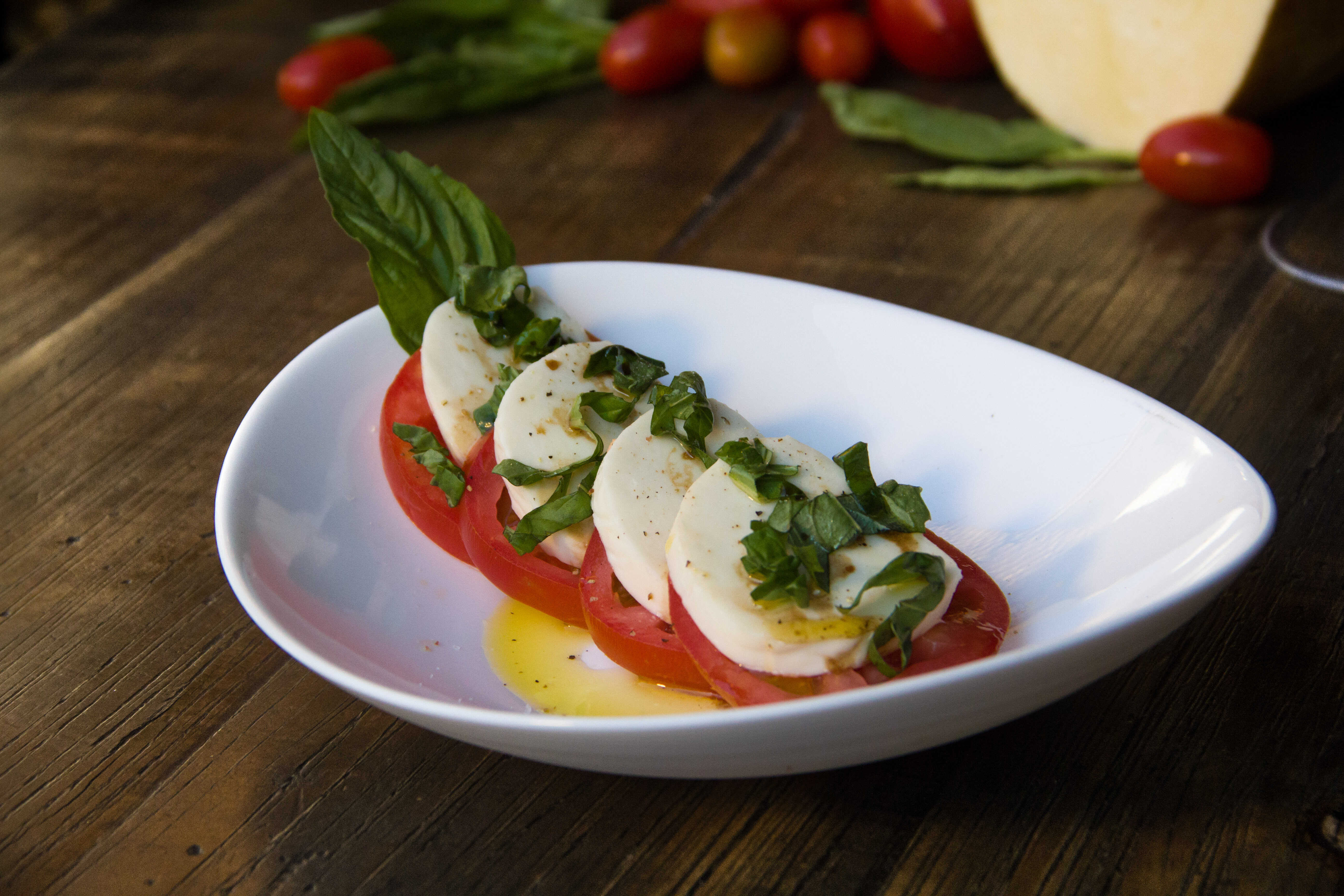 Rodaja de tomate, mozzarella fresca, albahaca, aceite de olivo y vinagre balsámico.
