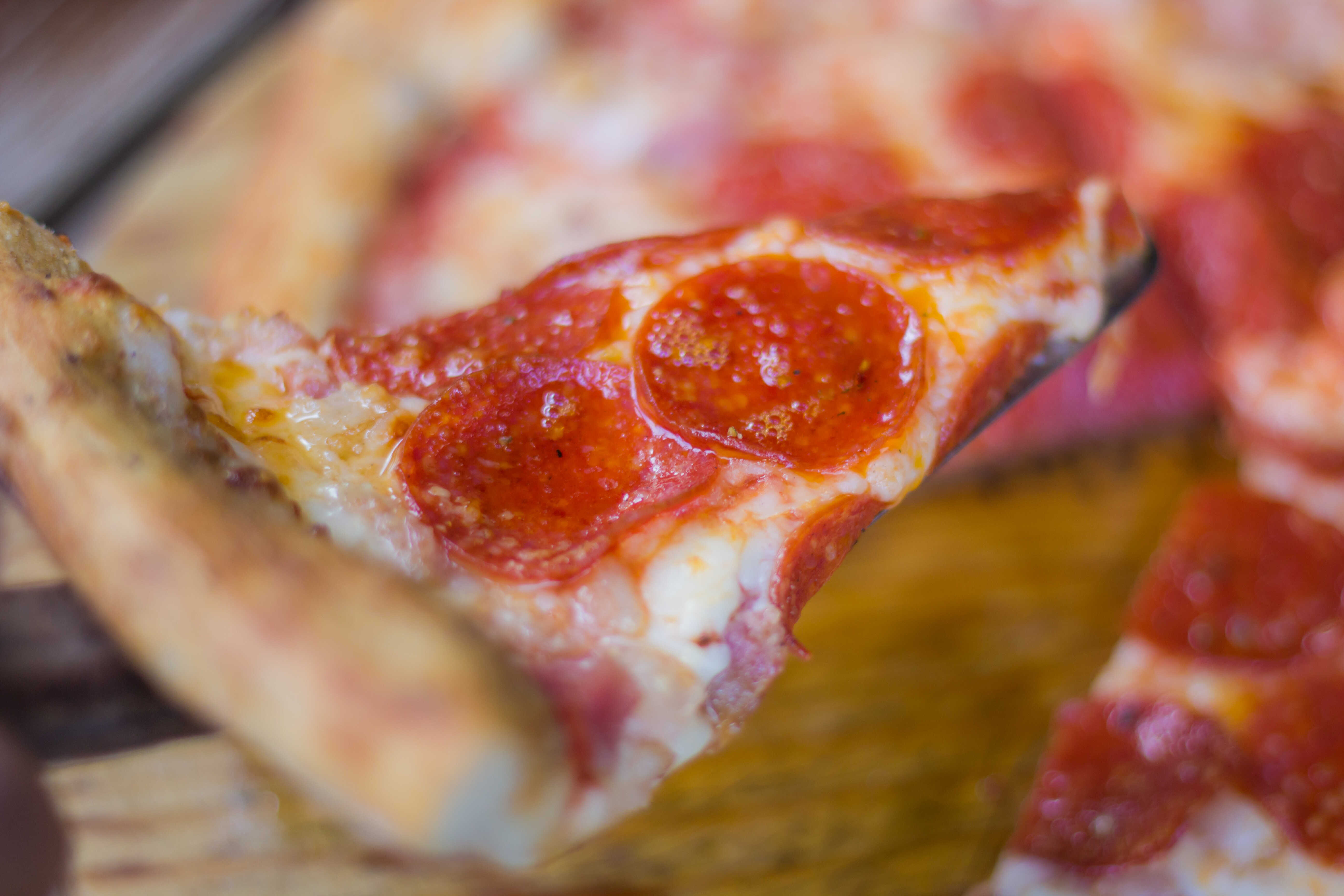 Salsa de tomate, mozzarella, pepperoni, tocino y parmesano a la orilla (8rebanadas).