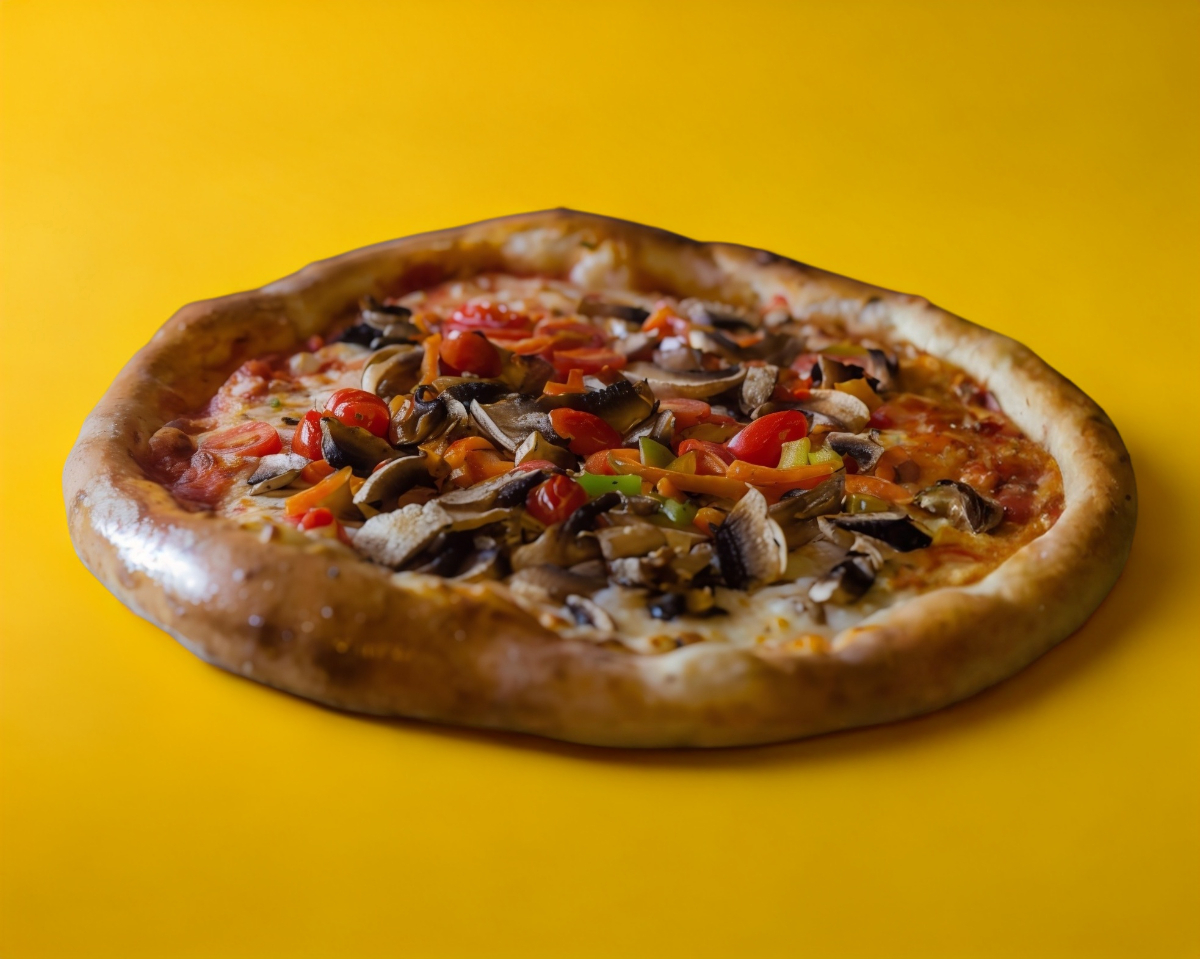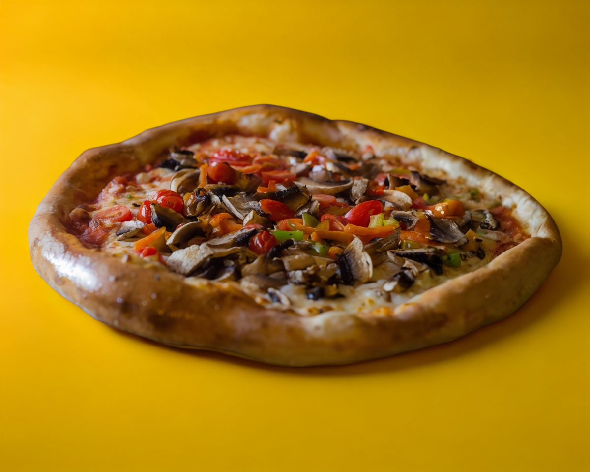 Salsa de tomate, mozzarella, pimiento morrón, champiñones y tomate cherry (8rebanadas).