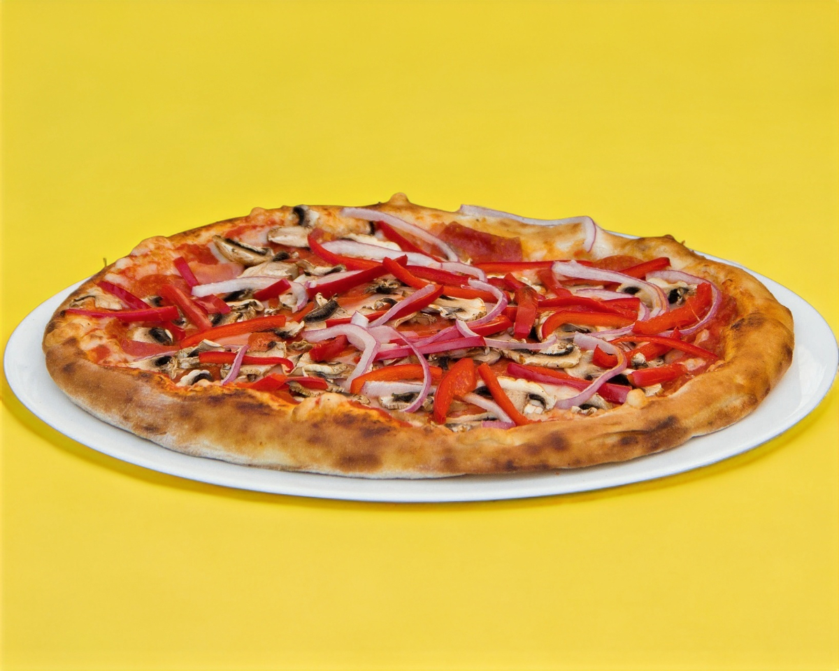 Salsa de tomate, mozzarella, jamón, pepperoni, champiñones, pimiento morrón y cebolla (8rebanadas).
