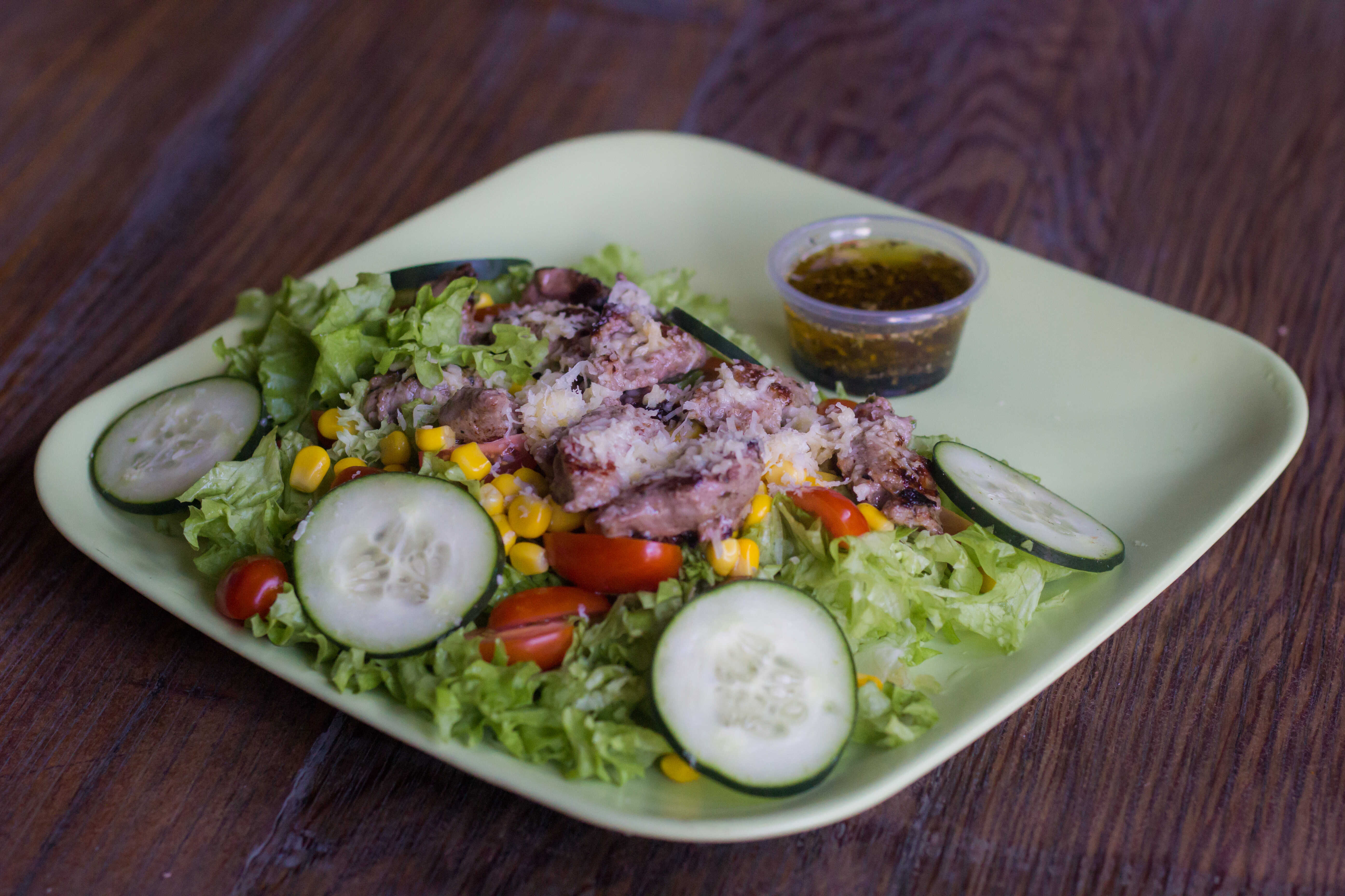 Lechuga, arrachera, tomate cherry, elote, pepino y queso parmesano.