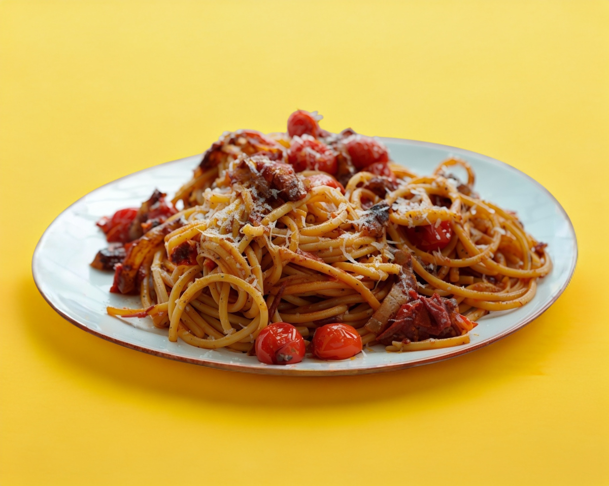 Salsa de tomate con tocino, ajo y chile de árbol.