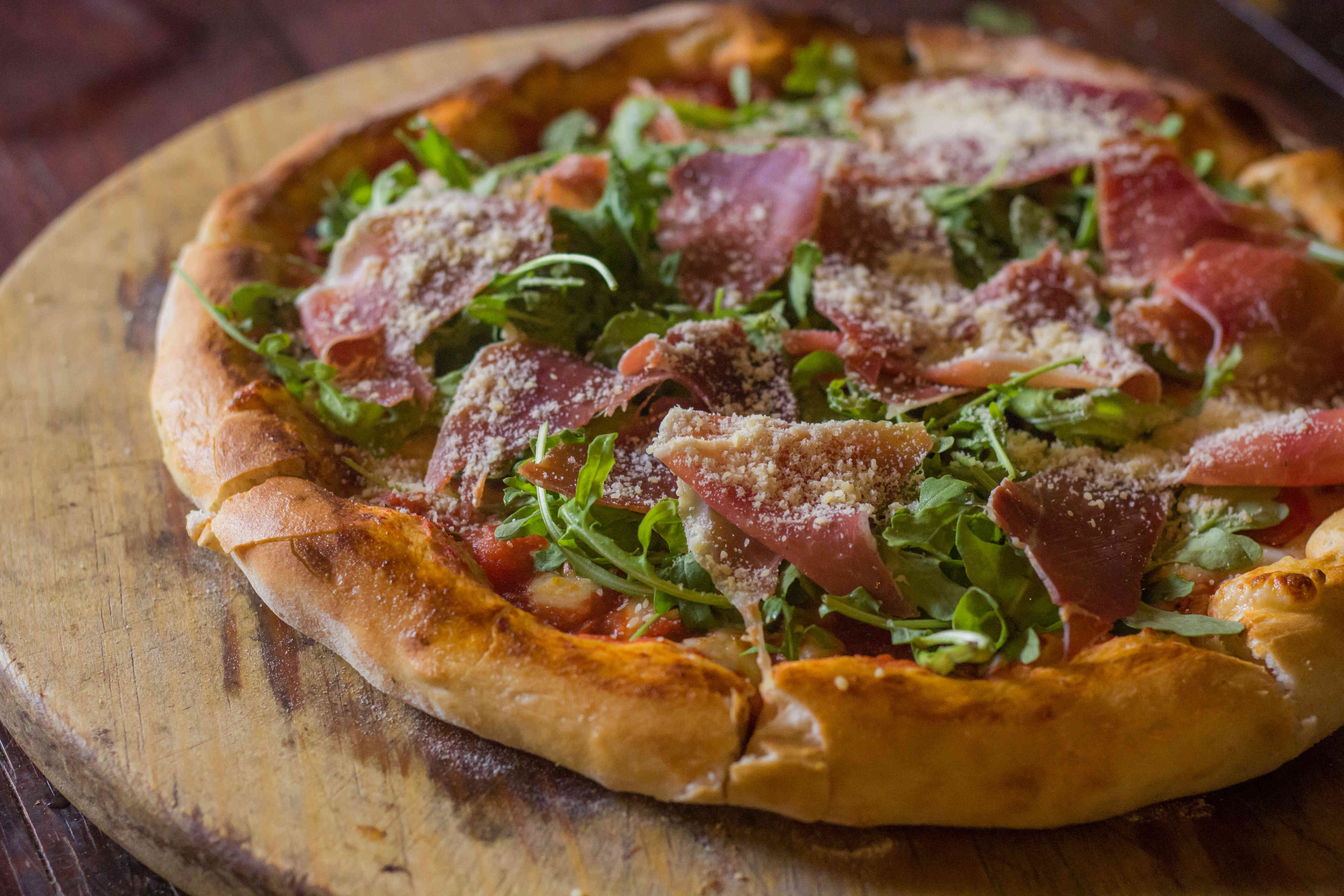 Salsa de tomate, mozarella, salami, jamon serrano, provola, champiñones y cebolla