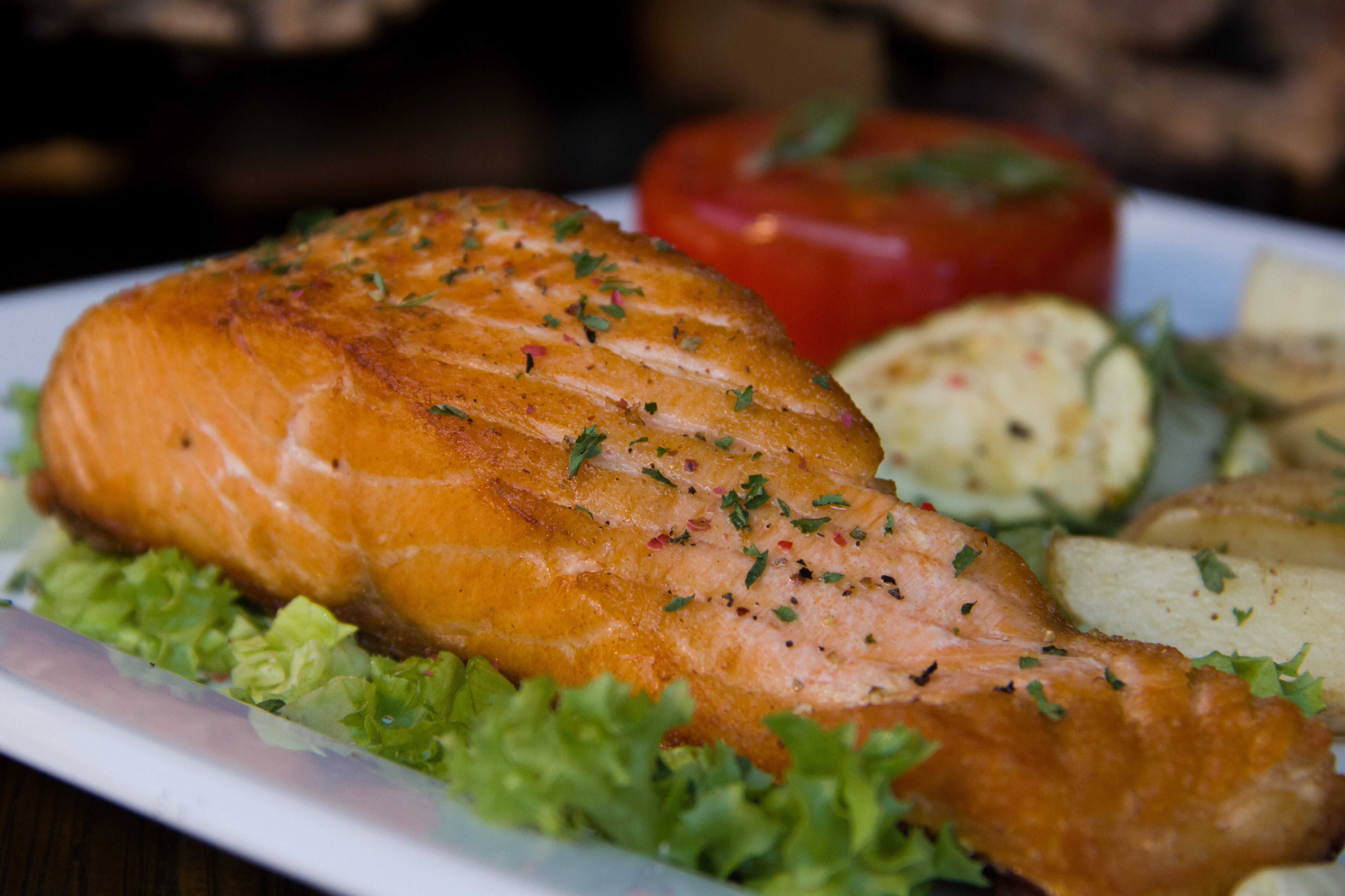 Salmón fresco al ajo y romero, acompañado de verduras a la parrilla.