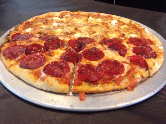Mitad de salsa de tomate, mozzarella y pepperoni y mitad queso mozzarella y especies de la casa (8rebanadas).