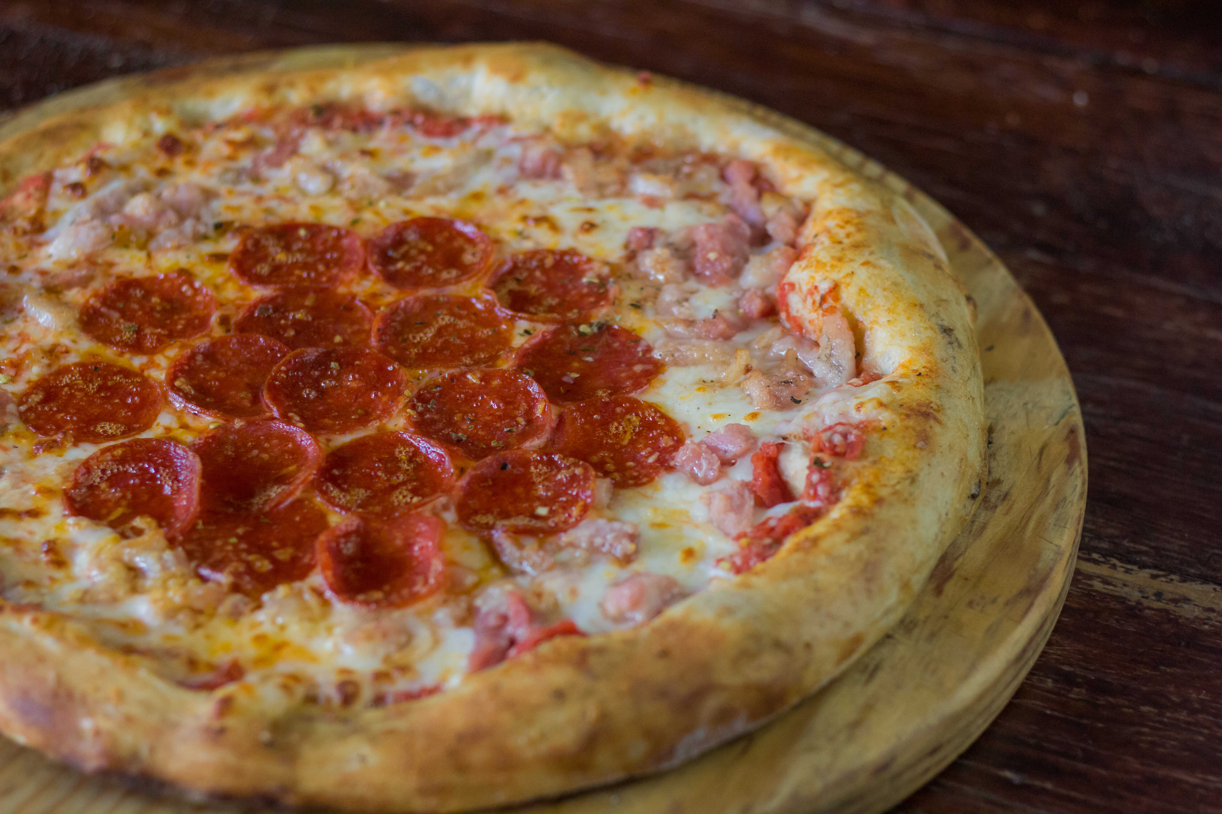 Salsa de tomate, mozzarella, chorizo, jamón, pepperoni y tocino (8rebanadas).