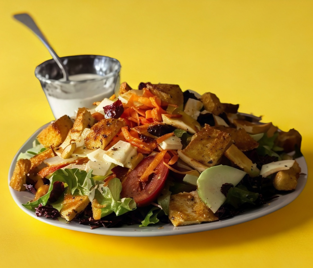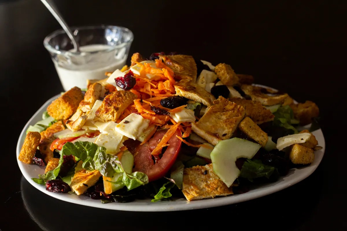 Lechuga sangría, jitomate, pepino, zahahoria, queso panela, arandanos, croutones y pollo, aderezo ranch.