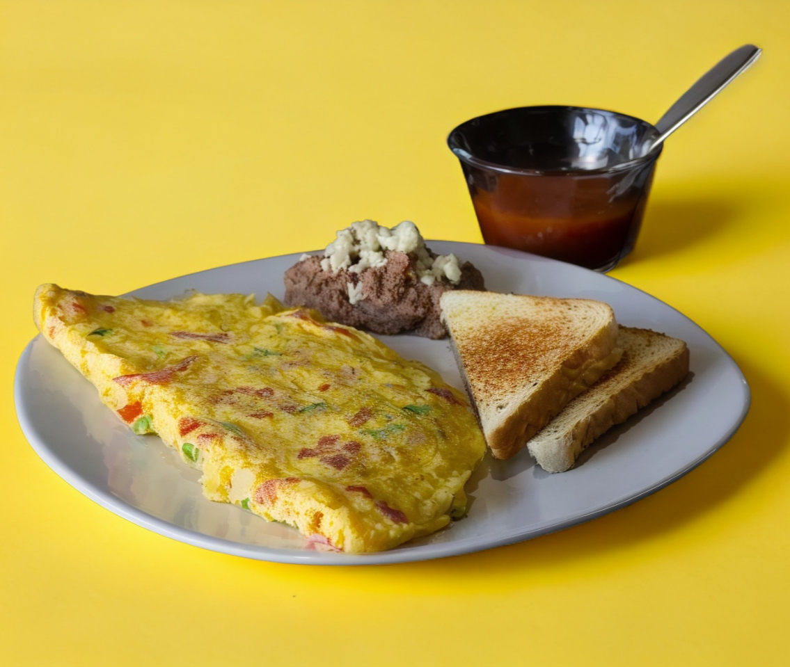 Huevos con preparación a elección, pan blanco o tortilla, frijoles, y salsa roja