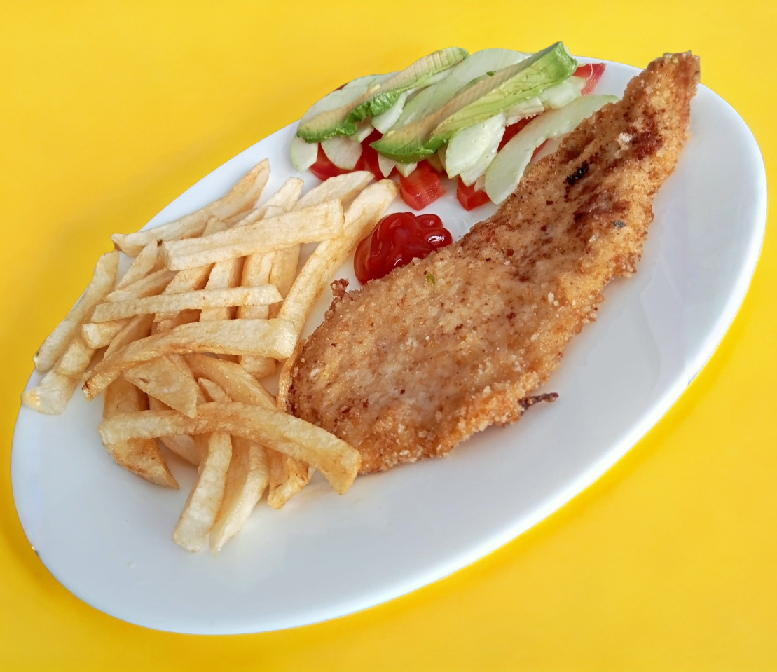 Pechuga empanizada con papas a la francesa y ensalada