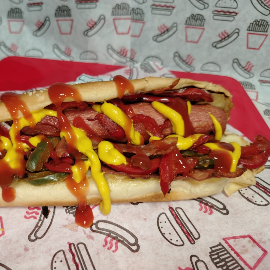Pan, Salchicha, mostaza, catsup, cebolla, jitomate, queso rallado, jalapeño