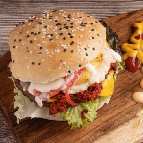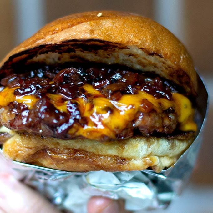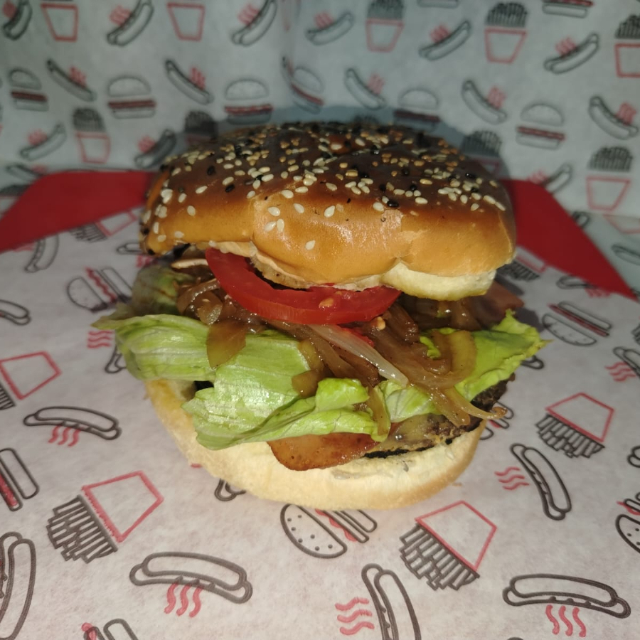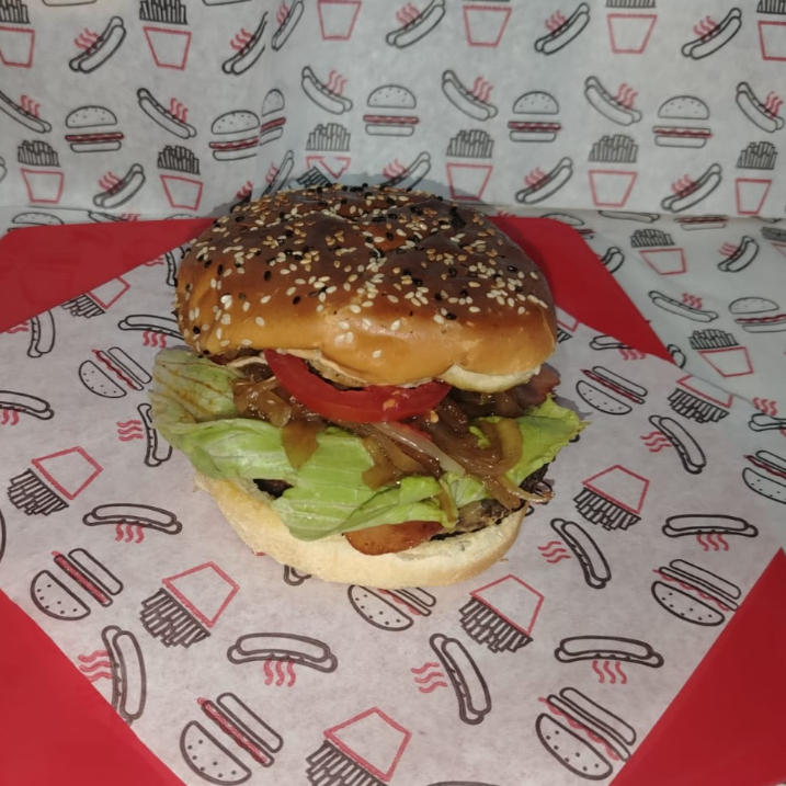 Carne de res, jamón, queso cheddar, tocino crujiente, cebolla, jitomate, lechuga y salsa BBQ.