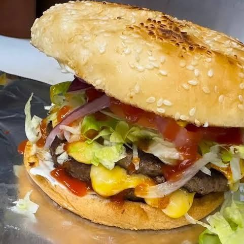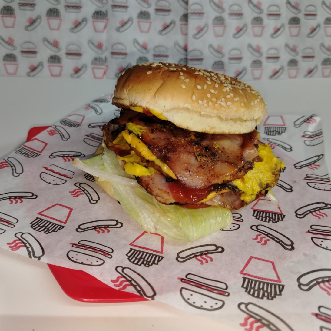 Carne de res, jamón, queso cheddar, piña cebolla, jitomate catsup, mostaza, mayonesa.