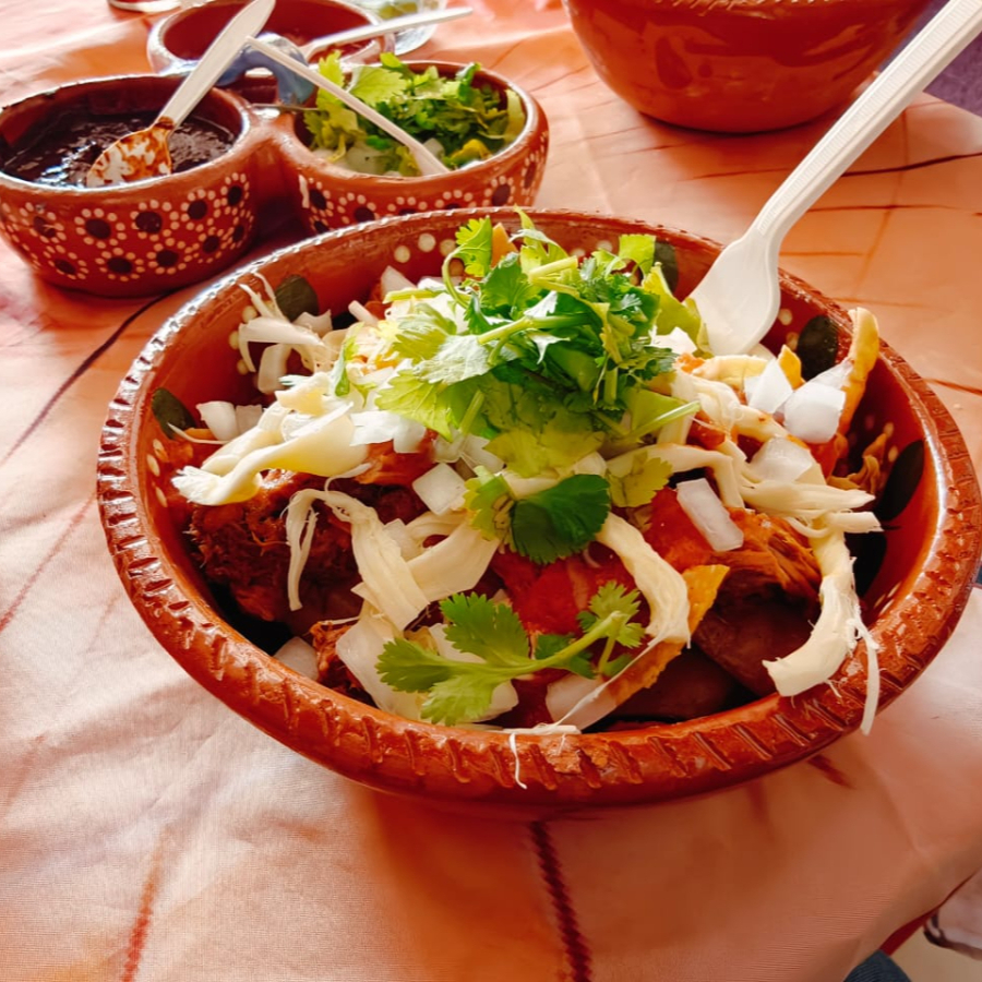 Totopos sazonados en salsa de tomate acompanados de carne de birria, queso oaxaca, crema, incluye (cebolla, cilantro y salsa) aparte