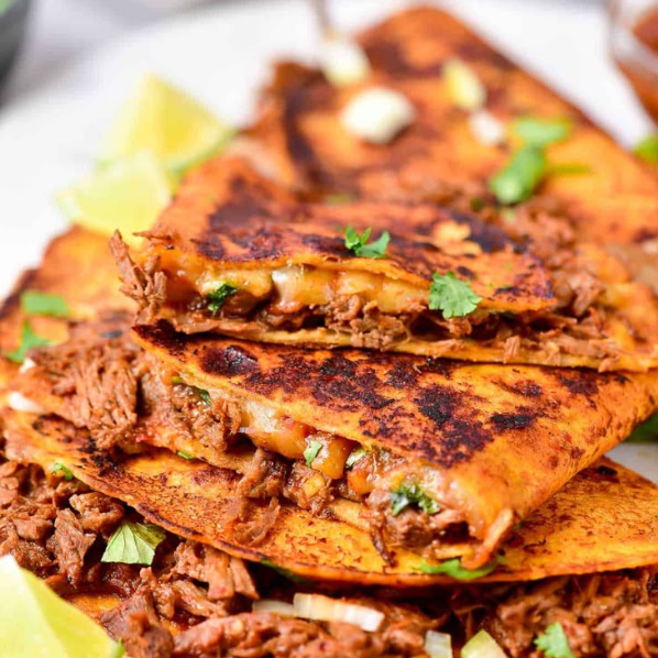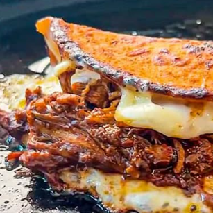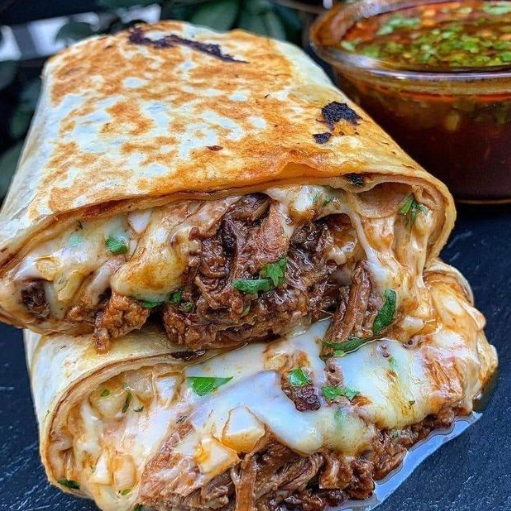 Tortilla de harina con carne de birria y queso oaxaca, incluye (cebolla, cilantro y salsa) aparte