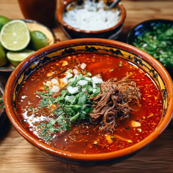 Deliciosos fideos hervidos en consome de birria acompanado de carne, queso oaxaca, incluye (cebolla, cilantro y salsa) aparte