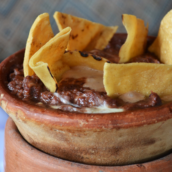 Orden de frijoles de la casa, acompanados de queso oaxaca y totopos hechos al momento, incluye (cebolla, cilantro y salsa) aparte