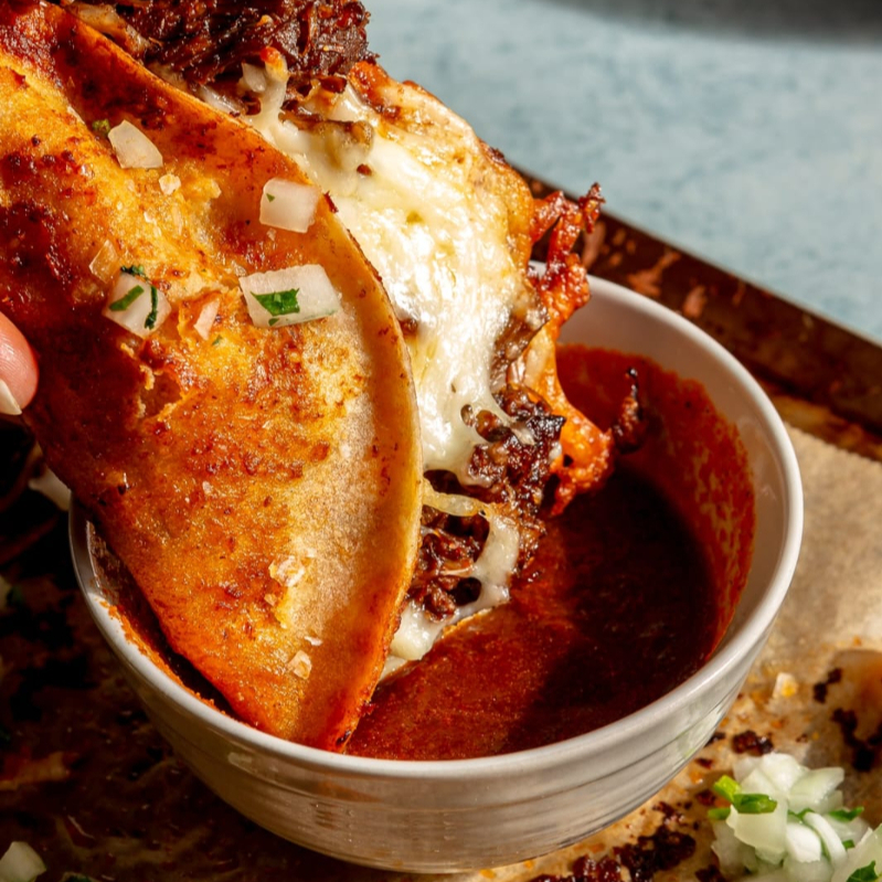Tortilla de maiz con carne de birria y queso oaxaca, incluye (cebolla, cilantro y salsa) aparte