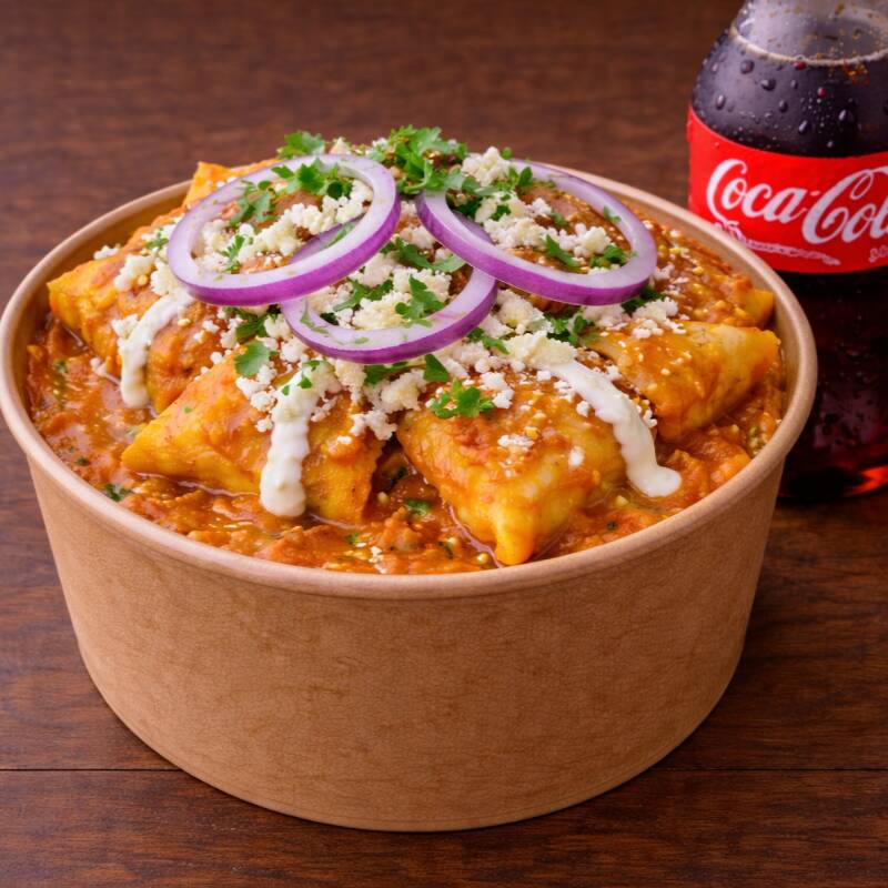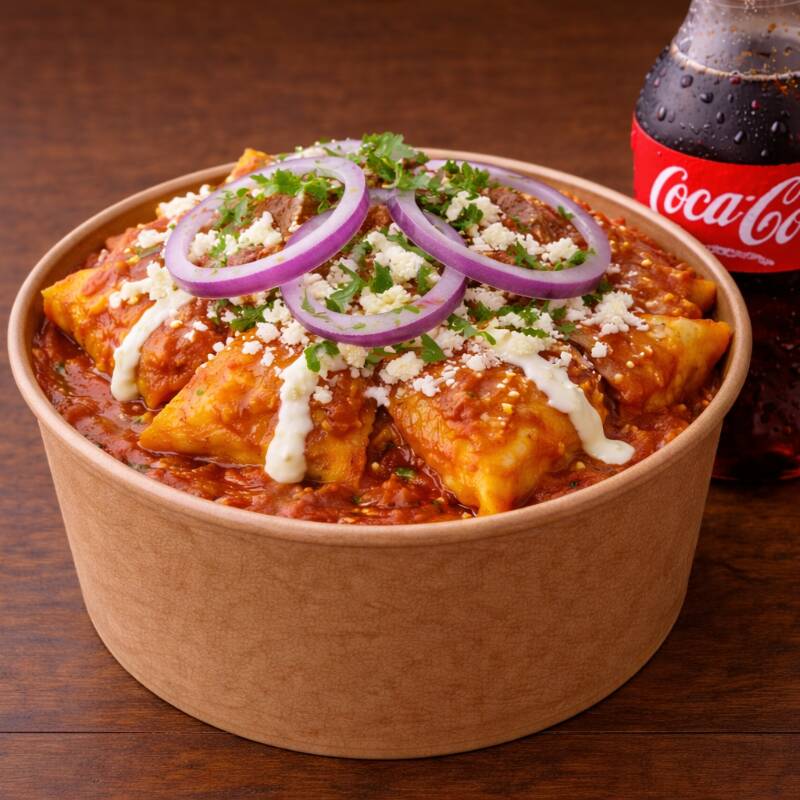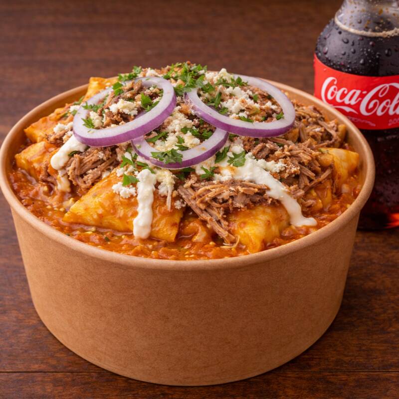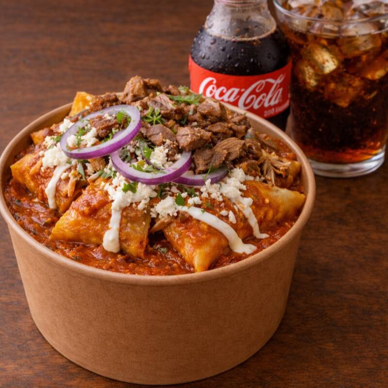 Deliciosos chilaquiles rellenos de chicharrón, bañados en salsa roja, con crema, cebolla y cilantro, en una base de frijolitos refritos.