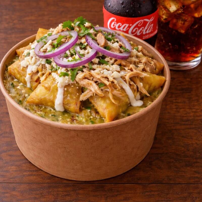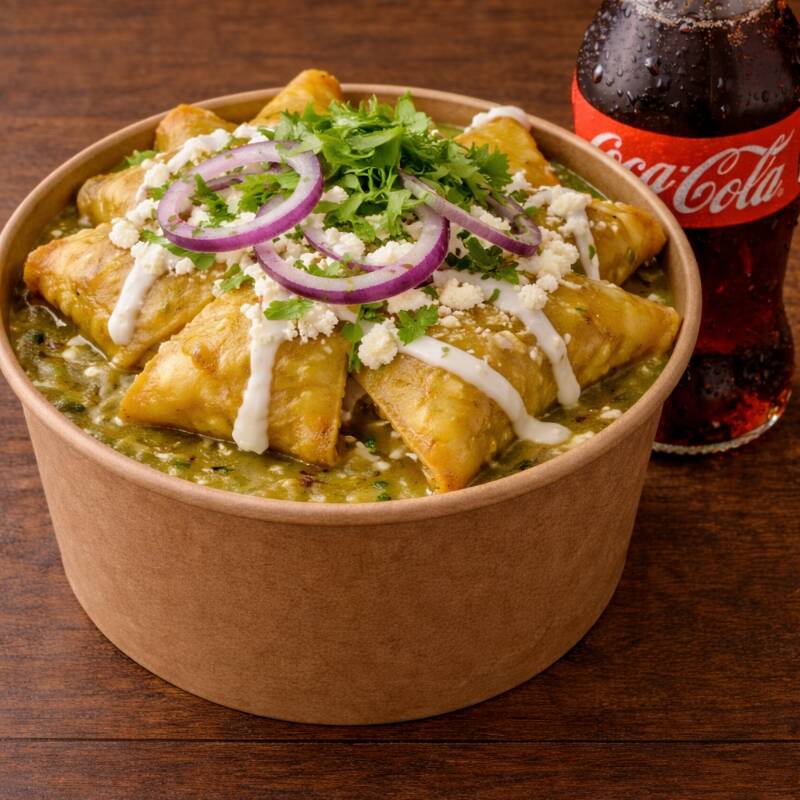 Deliciosos chilaquiles rellenos de chicharrón, bañados en salsa verde, con crema, cebolla y cilantro, en una base de frijolitos refritos.
