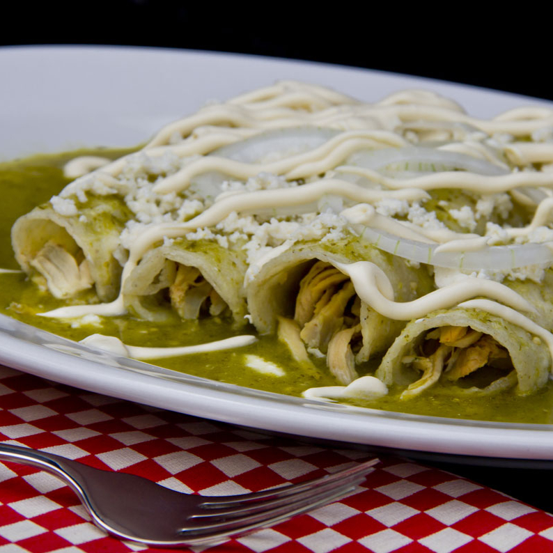 4 TORTILLAS RELLENAS DE POLLO, QUESO, LECHUGA, CEBOLLA, CREMA