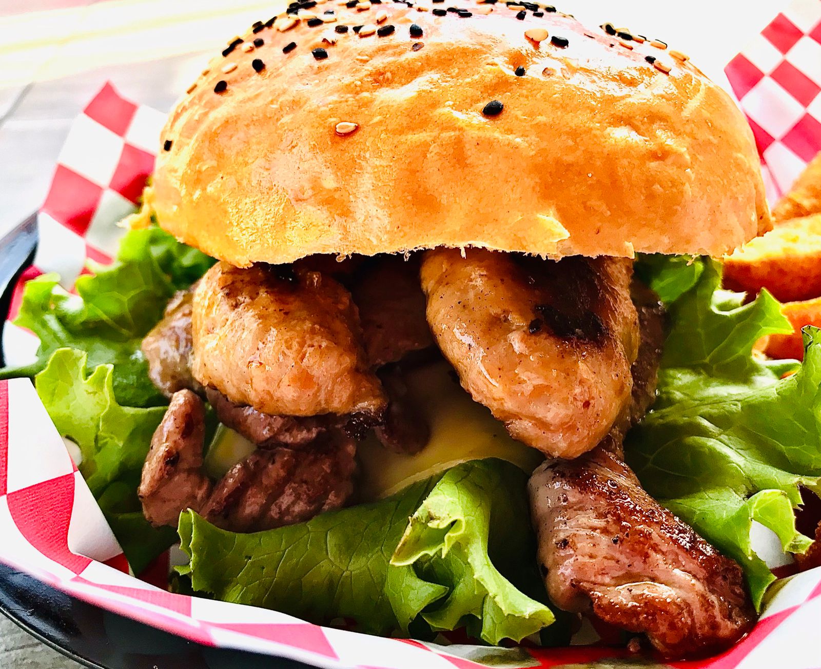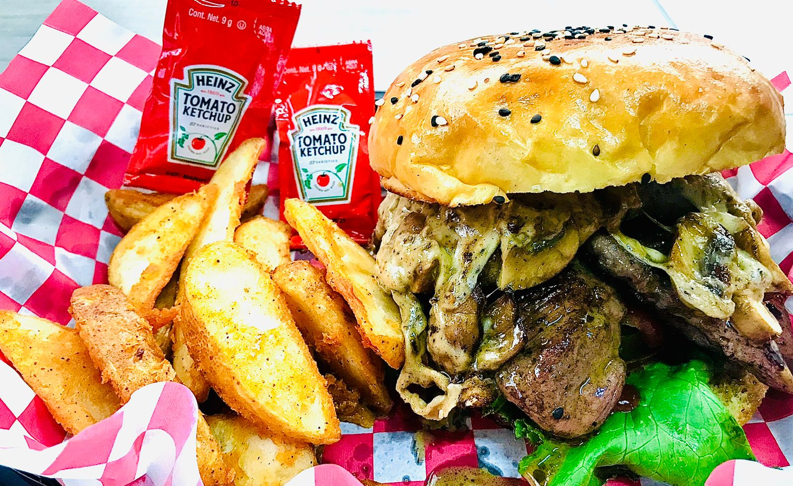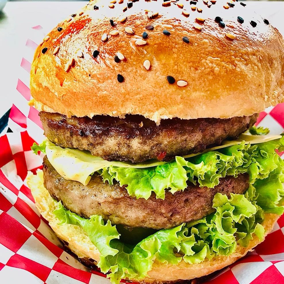 Doble carne molida angus, 300gr, mayonesa, tocino, queso manchego, lechuga, jitomate, cebolla sazonada, chiles jalapeños y cátsup. Incluye 100gr de papas gajo.