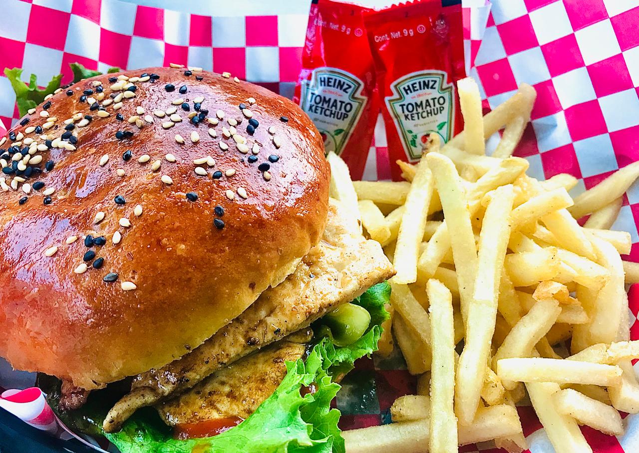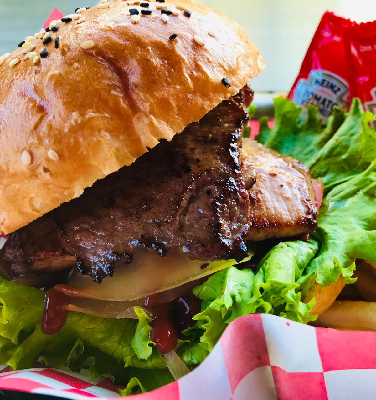 Hamburguesa con papas a la francesa, 160 g de carne 100% Sirloin de res con tocino. Queso manchego, lechuga. Jitomate, cebolla asada y 100 gr. De papas a la francesa.