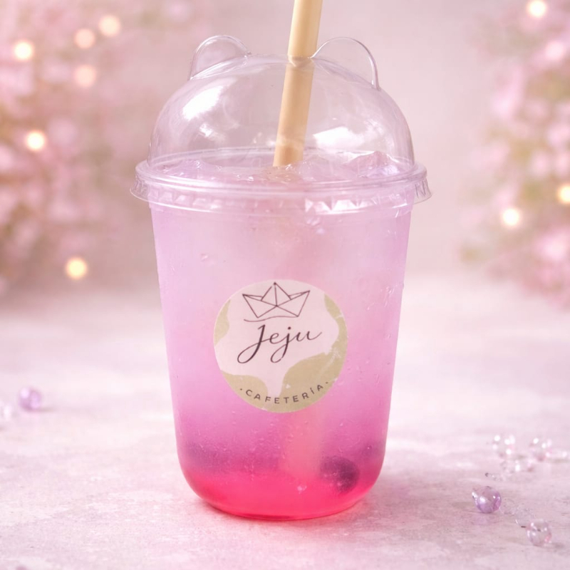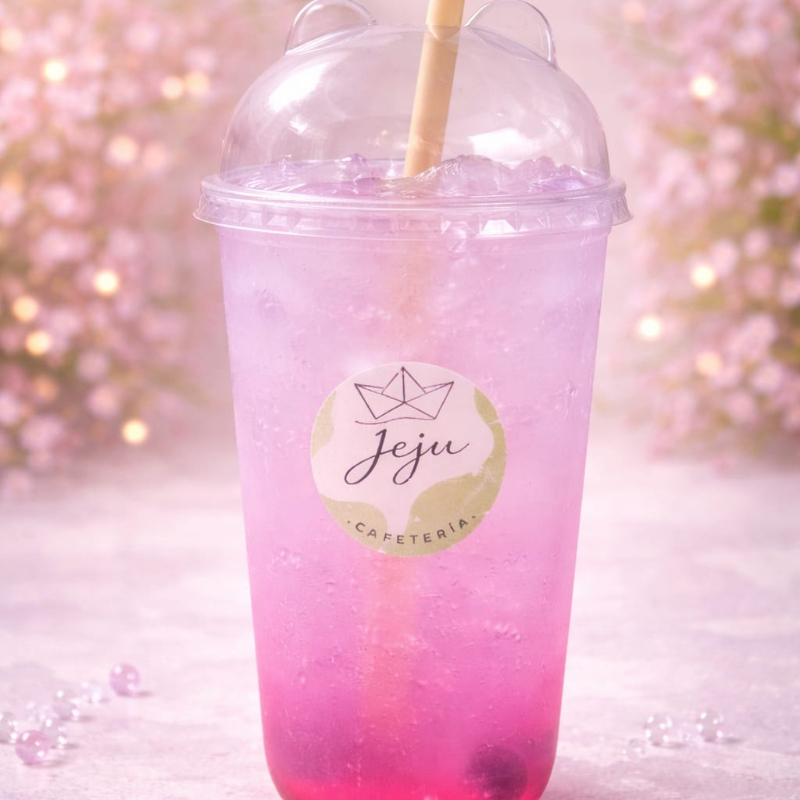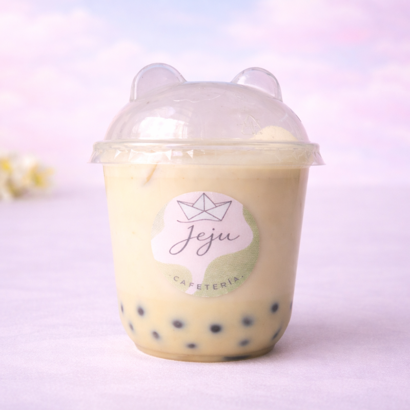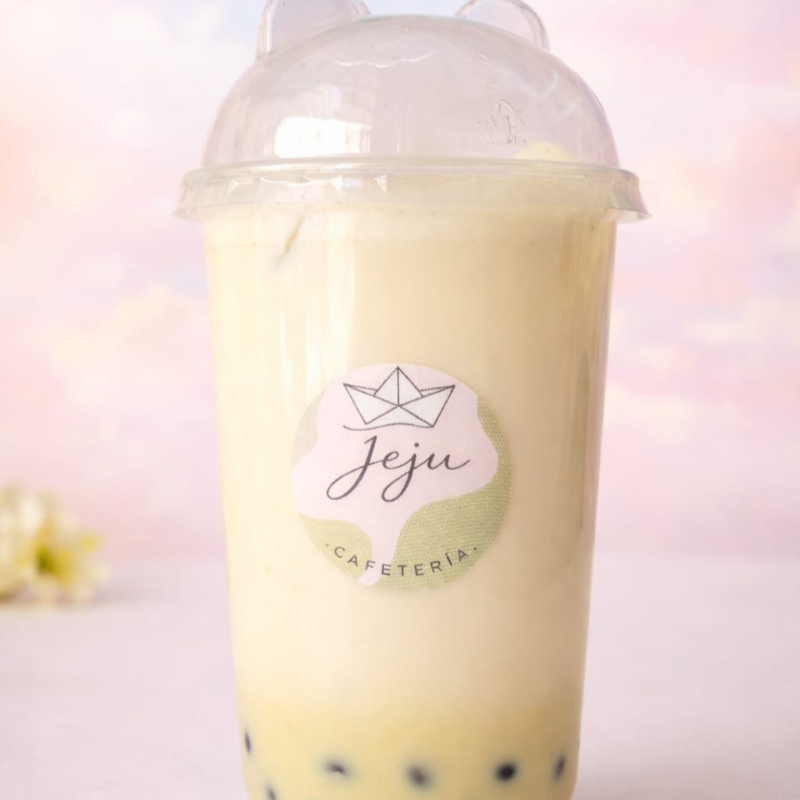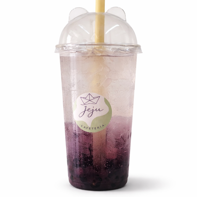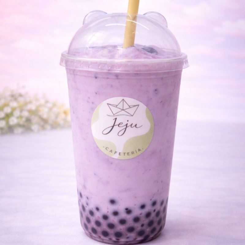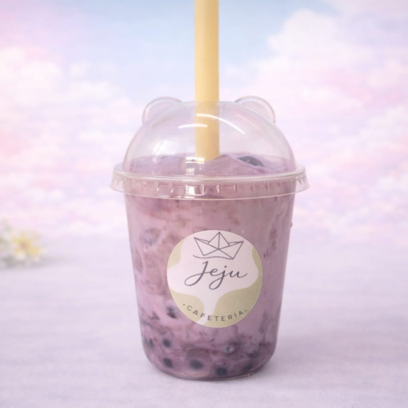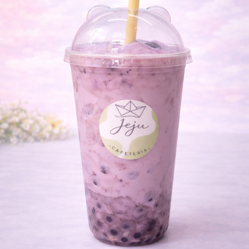 Sabor taro latte con leche deslactosada y burbujas explosivas. 24 onzas