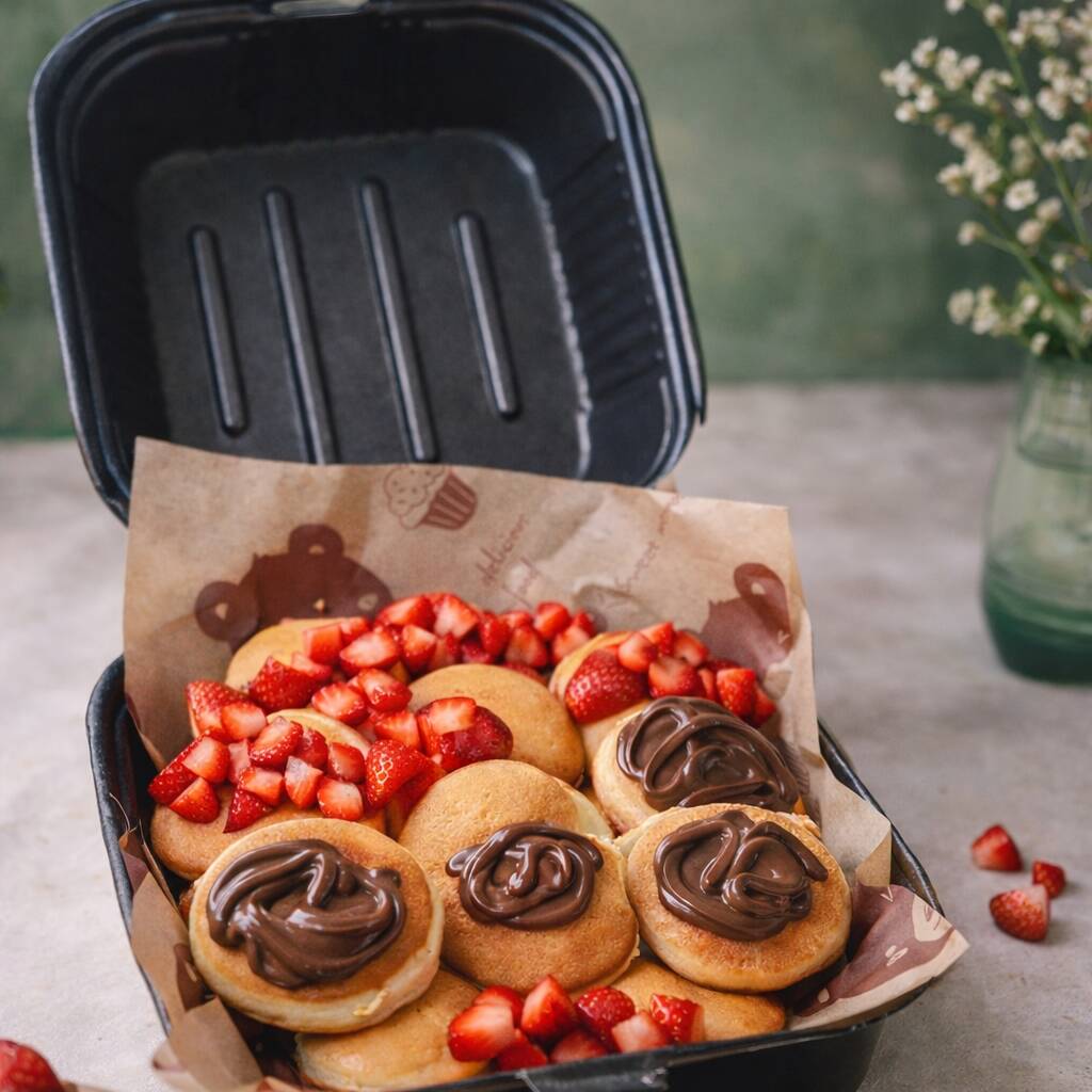 20 piezas de mini hotcakes con 1 base de : lechera, Nutella cajeta o biscoff y 1 complemento de: plátano, fresa , durazno, oreo , Philadelphia o galleta Biscoff